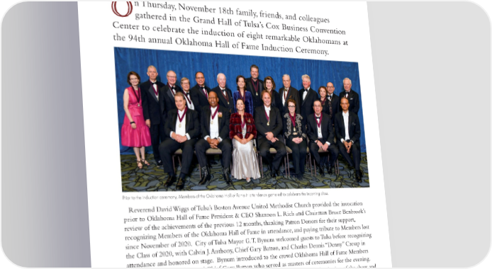n Thursday, November 18th family, friends, and colleagues Ogathered in the Grand Hall of Tulsa’s Cox Business Convention Center to celebrate the induction of eight remarkable Oklahomans at the 94th annual Oklahoma Hall of Fame Induction Ceremony. Prior to the induction ceremony, Members of the Oklahoma Hall of Fame in attendance gathered to celebrate the incoming class. Reverend David Wiggs of Tulsa’s Boston Avenue United Methodist Church provided the invocation prior to Oklahoma Hall of Fame President & CEO Shannon L. Rich and Chairman Bruce Benbrook’s review of the achievements of the previous 12 months, thanking Patron Donors for their support, recognizing Members of the Oklahoma Hall of Fame in attendance, and paying tribute to Members lost since November of 2020. City of Tulsa Mayor G. T. Bynum welcomed guests to Tulsa before recognizing the Class of 2020, with Calvin J. Anthony, Chief Gary Batton, and Charles Dennis “Denny” Cresap in attendance and honored on stage. Bynum introduced to the crowd Oklahoma Hall of Fame Members Governor Bill Anoatubby and Chief Gary Batton who served as masters of ceremonies for the evening. Miss Oklahoma Ashleigh Robinson performed “The National Anthem” at the beginning of the show and closed with “Oklahoma!” joined by the Oklahoma Hall of Fame Class of 2021. 2828