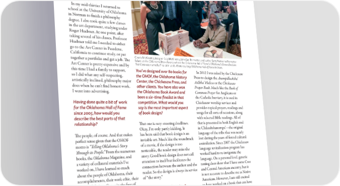 ART I did have the opportunity to take courses from a number of excellent teachers while in Fayetteville, most IN SERVICE notably the painter Donald Roller Wilson and master print maker OF THE STORYEd Bernstein. In my mid-thirties I returned to school at the University of Oklahoma in Norman to finish a philosophy degree. I also took quite a few classes in the art department, studying under Roger Huebner. At one point, after taking several of his classes, Professor Huebner told me I needed to either go to the Art Center in Pasadena, California to continue study, or put Cherie McKinstry, designer Skip McKinstry, John Earl Permetter, and author Betty Katherine Permetter together a portfolio and get a job. The Falato at the Oklahoma Book Awards where the Oklahoma Hall of Fame’s Oklahoma’s Brown Decision Art Center is pretty expensive and by Test Case was named a finalist in 2018. Photo courtesy Oklahoma Hall of Fame Archives. this time I had a family to support, You’ve designed over 80 books for In 2012 I was asked by the Chickasaw so I did what any self-respecting, the OHOF, the Oklahoma History Press to design the Anompilbashsha’ artistically inclined, philosophy major Center, the Chickasaw Press, and Asilhha’ Holisso or the Chickasaw does when he can’t find honest work. other clients. You have also won Prayer Book. Much like the Book of I went into advertising. the Oklahoma Book Award and Common Prayer for Anglicans or been a six-time finalist in that the Catholic breviary, it is used in Having done quite a bit of work competition. What would you Chickasaw worship services and for the Oklahoma Hall of Fame say is the most important aspect provides topical prayers, readings and since 2005, how would you of book design? songs for all sorts of occasions, along describe the best parts of that with selected Bible readings. All of relationship? That one is easy: meeting deadlines. that is presented in both English and Okay, I’m only partly kidding. It in Chikashshanompa’—the original The people, of course. And that makes has been said that book design is an language of the tribe that was nearly perfect sense given that the OHOF invisible art. Much like the soundtrack lost during the years of forced cultural motto is “Telling Oklahoma’s Story of a movie, if the design is too assimilation. Since 2007 the Chickasaw Through its People.” From the numerous noticeable, the reader may miss the language revitalization program has books, the Oklahoma Magazine, and story. Good book design does not call worked hard to re-invigorate the a variety of collateral materials I’ve attention to itself but facilitates the language. On a personal level, genetic worked on, I have learned so much connection between the author and the testing does show that I have some Cree about the people of Oklahoma, their reader. So the design is always in service and Central American ancestry, but it accomplishments, their work ethic, their of “the story.” is not accurate to describe me as Native faith, and their resilience in the face of American. However, I am still excited adversity. And if I can say this without Do you have any favorites? to have worked on a book that can have being obsequious, it has been a privilege an effect on the Chickasaw language to work with Gini Moore Campbell Yes, I have many, although the similar to the effect Gutenberg’s Bible and her team. Gini is clearly the hardest book I am most happy to have been had on the German language and working editor, writer, publisher, eagle- associated with was more an exercise in syllabary. That is much more satisfying eyed proofreader, account manager and typographic clarity than photo selection than winning awards for slick design train scheduler in the business. and editing and color choices. and clever advertising copy. 19