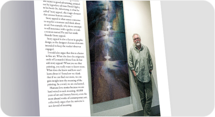 Whispers #6, Between Love and Indifference 36" x 27" archival pigment print on paper comes straight out of something I learned early as an advertising creative. The secret to good advertising, pointed out by legendary ad-man David Ogilvy in his book On Advertising, is what he called “story appeal...the magic element that arouses human curiosity.” Story appeal is what causes someone to stop for a moment and think about an ad. For example, why do we attempt to sell insurance with a gecko, or with a woman named Flo and her misfit friends? Story appeal. Story appeal is also a factor in graphic design, as the designer chooses elements intended to keep the reader/observer engaged. I would also argue that this is a factor in fine art. What else does the enigmatic smile of Leonardo’s Mona Lisa do but add story appeal? When you see that painting, you really want to know more. What does she know and how can I learn about it? Somehow we think that if we can find out more, we can gain insight into the meaning of the painting. In a word, we are enchanted. Humans love stories because we are hard-wired to seek meaning. 40,000 years of art and literary history, even the most absurd works of contemporary art, collectively argue that the universe is not devoid of meaning. Whispers #1, What is There Before There is Anything? Messengers #5, Jacob’s Ladder 36" x 27" archival pigment print on paper32" x 84" archival pigment print on canvas 23 35