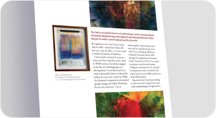 The Silence of Adam (40" x 22" archival pigment print on paper) is from the series “Before the Foundations,” first shown at Luther College in 2016 on the occasion of the 500th anniversary of the Reformation. You had a successful career as an advertising creative, winning dozens of awards and garnering some regional and national attention. What led you to make a switch and pursue the fine arts? Recognition is nice, but I always knew pursued gallery representation and that an Addy® Award and a buck will only did the requisite faculty show buy you a cup of coffee—at least it used while I was teaching at Oklahoma to before the advent of Starbucks. Christian University. But in 2017, I never really switched. It is more a through the organization Christians matter of where I spend my time. Back in the Visual Arts (CIVA), I was asked to Wolfe’s point, I was always engaged to prepare a solo show for Luther in the fine arts. Having begun as a College in northern Iowa. It was held photographer, I soon discovered that in conjunction with a conference the Alexa, Qoheleth 10:20 while I enjoyed the shoot, I enjoyed the school hosted on the 500th anniversary From the series “Window Poems” darkroom even more. In the late 1980s, of the Reformation. 14" x 16" archival pigment print on paper the Macintosh computer revolutionized Since that time I have been making graphic design and Adobe Photoshop my fine arts work a larger focus, even became my darkroom. I never while maintaining my design practice. Horeb—Holy Ground (40" x 22" archival pigment print on paper) is from the series “Before the Foundation,” first shown at Luther College in 2016 on the occasion of the 500th anniversary of the Reformation. 20