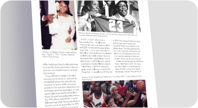 Wayman Tisdale was the second overall pick by the Indiana Pacers in the 1985 NBA draft. Courtesy Oklahoma Hall of Fame Archives. In 2001, his fourth album Face to in 2006, featured guest artists Bob James Face reached No. 1 on Billboard’s and George Duke, to name a few. contemporary jazz chart. Between 1995 Saxophonist Dave Koz, featured on the and 2010, he released nine jazz albums, album, stated, “the bass guitar typically four hit No. 1 on the jazz charts, and his isn’t a solo instrument, but Wayman was Wayman and Regina Tisdale on their wedding final album The Fonk Record was released able to not just make party music but to day—August 1, 1987. Courtesy Oklahoma posthumously. Tisdale earned honors as communicate amazing melodies and Hall of Fame Archives. the Bassist of the Year, National Smooth emotion. Music was the core of his soul.” Jazz Awards in 2002, the same year he Tisdale was inducted into the Oklahoma Miller had played bass for influential artists was inducted into the Oklahoma Sports Music Hall of Fame in 2011. His career such as Miles Davis and Herbie Hancock, Hall of Fame. In 2003 he released a pivot from athlete to musician inspired and was a successful composer, arranger, gospel album, followed a year later by Bernie Williams, a New York Yankee- and producer. Hang Time. His seventh record, Way Up! turned-jazz musician. “He was truly an It was difficult for Tisdale to be taken seriously as a musician, he was seen as Wayman Tisdale played for the Phoenix Suns from 1994 to 1997. Courtesy Oklahoma Hall of a basketball player who played music. Fame Archives. However, his mentor Miller saw great potential in him and when label executives at MoJazz heard his demo tapes, he was signed right away and his debut album Power Forward received positive reviews. The 1995 album reached No. 4 on the Billboard jazz chart. His second album In the Zone came out a year later. In 1997, he retired from the NBA to focus on his budding music career. That same year he became the first Oklahoma Player in any sport to have his jersey number retired, though in 2007 Blake Griffin asked Tisdale for permission to wear No. 23, which Tisdale granted. Two years after retiring from professional basketball he released Decisions. 53 35