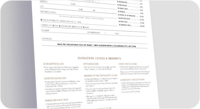 GAYLORD-PICKENS MUSEUM YES! I WOULD LIKE TO SUPPORT THE OKLAHOMA HALL OF FAME. MR./MRS./DR./MS. SUBSCRIPTION .....................................$35 INDIVIDUALISM ....................................$50 SPOUSE PREFERRED TELEPHONE ( ) PERSEVERANCE ..................................$100 ADDRESS EMAIL PIONEER SPIRIT .................................$250 CITY STATE ZIP OPTIMISM .........................................$500 FRIENDS OF THE MEDALLION ............$1,000 PREFERRED LISTING MISTLETOE CIRCLE ..........................$2,500 Your name as you wish to be acknowledged in Oklahoma Hall of Fame publications. GOLD CIRCLE ..................................$5,000 CHECK PAYABLE TO: OKLAHOMA HALL OF FAME CONSTANCY CIRCLE........................ $10,000 CHARGE MY VISA MASTERCARD DISCOVER AMEX NUMBER EXPIRATION DATE / CVV# SIGNATURE MAIL TO: OKLAHOMA HALL OF FAME | 1400 CLASSEN DRIVE | OKLAHOMA CITY, OK 73106 DONATION LEVELS & BENEFITS SUBSCRIPTION | $35 OPTIMISM | $500 GOLD CIRCLE | $5,000 •One-year subscription to Oklahoma: Magazine •Pioneer Spirit benefits plus one weekday use of the •Friends of the Medallion benefits plus one weekend of the Oklahoma Hall of Fame and Hall of Fame Devon Classroom or Centennial Boardroom use of a Gaylord-Pickens Museum event space* Headlines e-newsletter •Recognition at the Oklahoma Hall of Fame Banquet FRIENDS OF THE MEDALLION | $1,000 & Induction Ceremony and in the printed program. INDIVIDUALISM | $50 •Optimism benefits plus invitation for two to Friends of •Subscription benefits plus annual admission pass the Medallion special events in 2019 CONSTANCY CIRCLE | $10,000 to the Gaylord-Pickens Museum, home of the •One weekday use of a Gaylord-Pickens Museum •Gold Circle benefits plus the opportunity to honor one Oklahoma Hall of Fame event space* member of the Oklahoma Hall of Fame with a Link to •Invitations to gallery openings, book signings and •Advance opportunity to purchase tickets to the a Legacy at the Oklahoma Hall of Fame Banquet & other Oklahoma Hall of Fame and Gaylord-Pickens Oklahoma Hall of Fame Banquet & Induction Induction Ceremony in November Museum events Ceremony •Customized benefits package •Recognition in Oklahoma: Magazine of the PERSEVERANCE | $100 Oklahoma Hall of Fame and the Oklahoma Hall •Individualism benefits plus annual family admission of Fame Banquet & Induction Ceremony printed pass for two adults and household children under program 18 to the Gaylord-Pickens Museum, home of the Oklahoma Hall of Fame MISTLETOE CIRCLE | $2,500 PIONEER SPIRIT | $250 •Friends of the Medallion benefits plus one •Perseverance benefits plus a 25% discount on a weeknight use of a Gaylord-Pickens Museum event one-time rental of the Devon Classroom* space* *Event space must be used within one year of contribution and is subject to availability; additional fees may apply For more information about any of our donor levels or to customize your donor package at the $2,500 level and above, call Michelle Sopp at 405.523.3207. 64