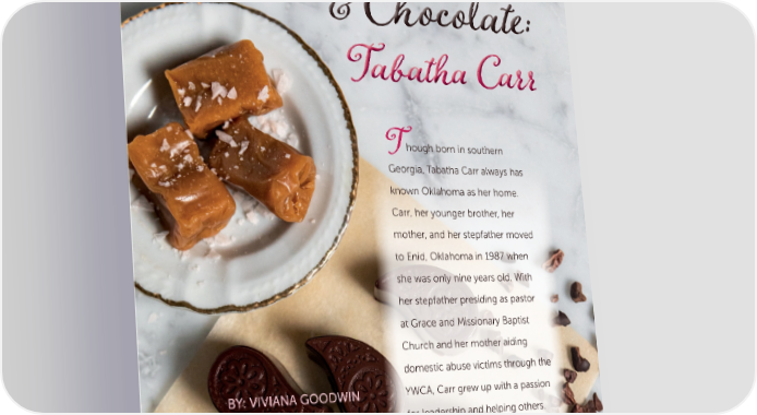 CollCollege, Comege, Computputersers & & ChocolatChocolate:e: TTabatabathha Carra Carr Though born in southern Georgia, Tabatha Carr always has known Oklahoma as her home. Carr, her younger brother, her mother, and her stepfather moved to Enid, Oklahoma in 1987 when she was only nine years old. With her stepfather presiding as pastor at Grace and Missionary Baptist Church and her mother aiding domestic abuse victims through the BY: VIVIANA GOODWIN YWCA, Carr grew up with a passion for leadership and helping others. 3