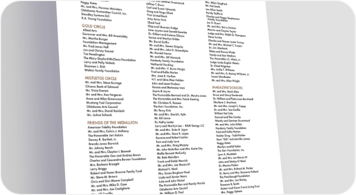 FRIENDS OF THE MEDALLION GIVING SOCIETY Friends of the Medallion have a shared interest in preserving and telling the stories of extraordinary Oklahomans. Their support sustains the 92-year tradition of recognizing accomplished Oklahomans with the state’s highest honor–induction into the Oklahoma Hall of Fame. MISSION PARTNERS Mr. and Mrs. Rick Cooper Mr. and Mrs. Robert J. Ross Mr. and Mrs. Bob Burke Mr. and Mrs. Mick Cornett William Schonacher The Chickasaw Nation Mr. and Mrs. Art Cotton Mr. T.W. Shannon Choctaw Nation of Oklahoma Bill and Carol Crawford Mr. Blake Shelton E.L. and Thelma Gaylord Foundation Page Davidson Kimberly Shirley The Puterbaugh Foundation Mr. and Mrs. Chad Dillingham Kayse M. Shrum, D.O. Ms. Rebecca Dixon Richard L. Sias CONSTANCY CIRCLE Mr. Everett Dobson Mrs. Milan Siegfried Sheryl and Bruce Benbrook Wendy and Gentner Drummond Mr. Hal Smith Inasmuch Foundation Jeffrey T. Dunn Lee Allan Smith Peggy Kates Carl and Susan Edwards Randy Stafford Mr. and Mrs. Herman Meinders Greg and Paige Elliott Charles and Peggy Stephenson Oklahoma Humanities Council, Inc. First United Bank Family Foundation Standley Systems LLC Amy Anne Ford Jon R. Stuart R.A. Young Foundation Chad Ford Mr. and Mrs. Barry Switzer Chip and Shannon Fudge Marnie and Clayton Taylor GOLD CIRCLE Jane Jayroe and Gerald Gamble Judge and Mrs. Ralph G. Thompson Allied Arts Dr. Gilbert and Aulena Gibson Steve Turnbo Governor and Mrs. Bill Anoatubby Earnie and Marilyn Gilder Charles and Sharen Jester Turney Ms. Martha Burger Mr. David Griffin Mr. and Mrs. Michael C. Turpen Foundation Management Mr. and Mrs. Steven Grigsby Dr. Jim Utterback Mr. Fred Jones Hall Mr. and Mrs. John D. Groendyke Blake and Donna Wade Jim and Christy Everest Mr. Harold Hamm Hardy and Kari Watkins Tim Headington Mr. and Mrs. Bill Hancock The Honorable J.C. Watts, Jr. The Mary Gaylord McClean Foundation Hardesty Family Foundation Judge Linda English Weeks Larry and Polly Nichols Nathaniel Harding Dr. Chad Wiginton Shannon L. Rich Mr. and Mrs. V. Burns Hargis Mrs. Avilla T. Williams Walton Family Foundation Fred and Kellie Harlan Mr. and Mrs. G. Rainey Williams, Jr. Mrs. Jane B. Harlow Susan Winchester MISTLETOE CIRCLE H.T. and Edna Mae Holden Mr. and Mrs. Allen Wright Mr. and Mrs. Steve Burrage John and Janet Hudson MAGAZINE DONORS Citizens Bank of Edmond Ronnie and Shahnaaz Irani Mr. and Mrs. Mark Allen Ms. Tricia Everest Jayne & Jayne Bruce and Sheryl Benbrook Mr. and Mrs. Ken Fergeson The Honorable Bernard and Dr. Mautra Jones Dr. William and Theta Juan Bernhardt Anne and Mike Greenwood The Honorable and Mrs. Frank Keating Sharlene S. Branham Mustang Fuel Corporation Mr. Christian K. Keesee Mr. and Mrs. Joseph E. Cappy Oklahoma Arts Council The Kerr Foundation, Inc. Dr. and Mrs. Tom Carlile Mr. and Mrs. David Rainbolt Mr. Percy Kirk William Tad Cole Ms. JoAnn Schaub Mr. and Mrs. David L. Kyle Samuel and Rita Combs Mr. Bill Lance Wendy and Gentner Drummond FRIENDS OF THE MEDALLION Dr. Kathy Laster Mr. and Mrs. John Gibbs American Fidelity Foundation Larry and Marilyn Lee -- RAM Energy LLC Hardesty Family Foundation Mr. and Mrs. Calvin J. Anthony Mr. and Mrs. Duke R. Ligon Fred and Kellie Harlan The Honorable Jari Askins Mr. and Mrs. Dave R. Lopez Holder Drug - Todd Holder Dewey R. Bartlett, Jr. Roxana and Robert Lorton Kent “Gib” and Jennifer James Brenda Jones Barwick Tom and Judy Love Peggy Kates Mr. Johnny Bench Mr. and Mrs. Greg Massey Marilyn and Ed Keller Mr. and Mrs. Clayton I. Bennett Mr. John McArthur and Mrs. Karla Oty The Kerr Foundation, Inc. The Honorable Dan and Andrea Boren Mollie Bennett McCurdy Lynn A. McIntosh Charles and Cassandra Bowen Foundation Mr. Bob Meinders Mr. and Mrs. Joe Moran III Mrs. Barbara Braught Frank and Debbi Merrick John and Shirley O’Neal Larry Briggs Mr. and Mrs. Joe Moran III Dr. Marion Paden Robert and Karen Browne Family Fund Michael S. Neal Mr. and Mrs. Richard M. Parker Mr. Steve M. Brown Mrs. Susan Bingham Neal Dr. Barry and Mrs. Roxanne Pollard Chris and Gini Moore Campbell Linda and Xavier Neira The Puterbaugh Foundation Mr. and Mrs. Mike D. Case Julie and John Nickel Mr. and Mrs. Jon Shirley Mr. and Mrs. Joe Castiglione The Honorable Ron and Kandy Norick Brannon B. Smith Mrs. Jill Castilla Oklahoma Arts Council Robert and Karen Travis Living Trust Ms. Kristin Chenoweth Mr. William G. Paul Mrs. Peggy Upham Mr. Stan Clark S. Bond and Lori Payne Mr. Pete White Dean Andrew M. Coats Adam and Whitney Rainbolt Mr. and Mrs. Joseph H. Williams Samuel and Rita Combs Mr. Robert Reilly and Judge Maxey Reilly Dr. and Mrs. Kenneth H. Cooper Mr. and Mrs. Frank C. Robson THANK YOU TO ALL DONORS OF A portion of every donation, regardless of the amount, With questions, please contact Michelle Sopp at THE OKLAHOMA HALL OF FAME goes toward funding Oklahoma: Magazine of the 405.523.3207 or ms@oklahomahof.com. This list Oklahoma Hall of Fame and its distribution to every represents donors making unrestricted contributions senior high school library statewide. as of October 31, 2021. 62