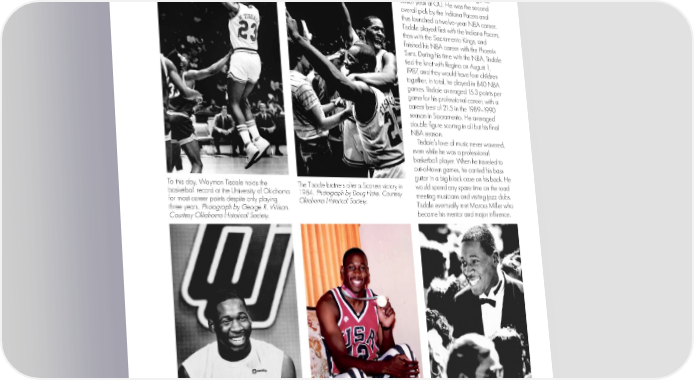 toward his teammates. The phrase team spirit’ cannot apply to anybody more than Wayman Tisdale.” After the Olympics, Tisdale decided to enter the 1985 NBA draft and forgo his senior year at OU. He was the second overall pick by the Indiana Pacers and thus launched a twelve-year NBA career. Tisdale played first with the Indiana Pacers, then with the Sacramento Kings, and finished his NBA career with the Phoenix Suns. During his time with the NBA, Tisdale tied the knot with Regina on August 1, 1987, and they would have four children together. In total, he played in 840 NBA games. Tisdale averaged 15.3 points per game for his professional career, with a career best of 21.5 in the 1989–1990 season in Sacramento. He averaged double figure scoring in all but his final NBA season. Tisdale’s love of music never wavered, even while he was a professional basketball player. When he traveled to out-of-town games, he carried his bass guitar in a big black case on his back. He To this day, Wayman Tisdale holds the The Tisdale brothers after a Sooners victory in would spend any spare time on the road basketball record at the University of Oklahoma 1984. Photograph by Doug Hoke. Courtesy meeting musicians and visiting jazz clubs. for most career points despite only playing Oklahoma Historical Society. Tisdale eventually met Marcus Miller who three years. Photograph by George R. Wilson. became his mentor and major influence. Courtesy Oklahoma Historical Society. Wayman Tisdale was one of 20-plus players The U.S. Olympic basketball team won gold, Wayman Tisdale stands nearly a foot taller invited to the next phase of the U. S. Olympic with Wayman Tisdale leading the undefeated than the 500-person crowd that gathered at the basketball team tryouts. Photograph by team in the most rebounds. Courtesy Oklahoma Oklahoma State Capitol to honor Oklahoma’s the Associated Press. Courtesy Oklahoma Hall of Fame Archives. Olympic athletes. Photograph by the Associated Historical Society. Press. Courtesy Oklahoma Historical Society. 52
