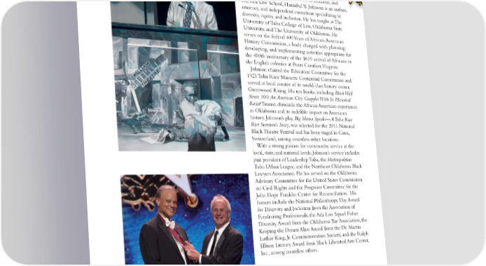 HANNIBAL B. JOHNSON TULSA graduate from Fort Smith, Arkansas’ Northside A High School, the University of Arkansas, and Harvard Law School, Hannibal B. Johnson is an author, attorney, and independent consultant specializing in diversity, equity, and inclusion. He has taught at The University of Tulsa College of Law, Oklahoma State University, and The University of Oklahoma. He serves on the federal 400 Years of African-American History Commission, a body charged with planning, developing, and implementing activities appropriate for the 400th anniversary of the 1619 arrival of Africans in the English colonies at Point Comfort, Virginia. Johnson chaired the Education Committee for the 1921 Tulsa Race Massacre Centennial Commission and served as local curator of its world-class history center, Greenwood Rising. His ten books, including Black Wall Street 100: An American City Grapples With Its Historical Racial Trauma, chronicle the African American experience in Oklahoma and its indelible impact on American history. Johnson’s play, Big Mama Speaks—A Tulsa Race Riot Survivor’s Story, was selected for the 2011 National Black Theatre Festival and has been staged in Caux, Switzerland, among countless other locations. With a strong passion for community service at the local, state, and national levels, Johnson’s service includes past president of Leadership Tulsa, the Metropolitan Tulsa Urban League, and the Northeast Oklahoma Black Lawyers Association. He has served on the Oklahoma Advisory Committee for the United States Commission on Civil Rights and the Programs Committee for the John Hope Franklin Center for Reconciliation. His honors include the National Philanthropy Day Award for Diversity and Inclusion from the Association of Fundraising Professionals, the Ada Lois Sipuel Fisher Diversity Award from the Oklahoma Bar Association, the Keeping the Dream Alive Award from the Dr. Martin Luther King, Jr. Commemoration Society, and the Ralph Ellison Literary Award from Black Liberated Arts Center, Inc., among countless others. KENNETH J. LEVIT TULSA Executive Director of the George Kaiser Family Foundation, Levit presented Hannibal B. Johnson for induction. 363636