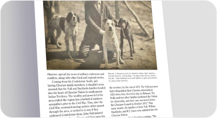 Observer, spread the news of military endeavors and The son of Rebecca and J.O. Hamilton, Rufus “Bud” Hamilton, conflicts, along with other local and regional stories. with his favorite hunting dogs. The dog on the left was named Pointer. Rufus Hamilton was Mark Hamilton’s great-grandfather. Coming from the Confederate South, and Courtesy Mark Hamilton. having Choctaw family members, it shouldn’t seem unusual that the Null and Buckholts families headed the territory by the end of 1872. The Null ancestors into the heart of Choctaw Nation in southeastern had relinquished their Choctaw citizenship in Indian Territory. The wealthy and powerful of the 1832 when they elected to stay in Alabama. The area crafted the region into a hotbed of southern Nulls and two other families petitioned the Nation sympathies prior to the Civil War. Thus, after the for citizenship, and their case was heard before Civil War, westward-moving settlers either passed the Choctaw Council in October 1872.” That through the area, or settled in to stay if they same month, the families of John Null, William embraced Confederate ideas. John Null planned Buckholts, and R.T. Jones were admitted into the to find land near Boggy Depot, and then move his Choctaw Nation. ranching operations from Texas to the new location. However, as Mark Hamilton explains, “The But the situation became sticky after the ruling did not solve anything for J.O. Hamilton, family arrived. According to Mark Hamilton, “In who was a single white male simply living with the spring of 1872, the Choctaw entered into an his sister’s family. Then something happened. agreement with the United States that called for J.O. Hamilton, and his sister-in-law Rebecca Null, non-citizens of Choctaw Nation to be removed from married late October 1872, and that allowed him 13 35