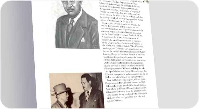 ROSCOE DUNJEE OKLAHOMA CITY 2021 POSTHUMOUS HONOREE or 40 years as editor of Oklahoma City’s only black Fnewspaper, The Black Dispatch, Roscoe Dunjee led the way in the struggle for civil rights. In his own words, he was endeavored “to interpret the mind, the aspiration, the object, and longing of his people.” Dunjee was aware of the dire need for his people to have a voice in the affairs of the city and state and, after purchasing a small-job printing plant, published the first edition of the newspaper at the age of 31. Dunjee, who saw and experienced firsthand the terrible discrimination and knew there was no representation at any level of government, was vitally interested in the work of the National Association for the Advancement of Colored People (NAACP). A member of the NAACP’s national board of directors, he served for sixteen years as president of the Oklahoma State Conference of Branches of the NAACP. In 1932 the Guthrie, Tulsa, Chickasha, Muskogee, and Oklahoma City branches met and formed the nation’s first state conference of NAACP branches. Dunjee believed that this type of structure would allow the pooling of resources for a more effective fight against discrimination and segregation. Under Dunjee’s leadership the state organization became involved in several court cases that would affect segregation in Oklahoma, including the Ada Lois Sipuel (Fisher) and George McLaurin cases that dealt with segregation in higher education and the Jess Hollins case which focused on segregated juries. Born in Harper’s Ferry, Virginia, with his family Dunjee relocated to Oklahoma Territory in 1892. Although he briefly attended Oklahoma’s Colored Agricultural and Normal University, known today as Langston University, it was the inheritance of a 1,500-volume library, combined with his analytical mind, that made him one of the most educated men in Oklahoma. 46