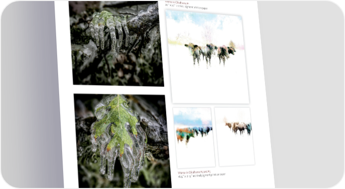 Revenge of the Green Knight, #1 20" x 20" archival pigment print on paper Winter in Oklahoma #1 20" x 20" archival pigment print on paper Winter in Oklahoma #2 and #3 16.5" x 21.5" archival pigment prints on paper Revenge of the Green Knight, #3 20" x 20" archival pigment print on paper These images, shot on an iPhone 11, shot in the aftermath of the untimely Oklahoma ice storm in October of 2020 effectively summarizing life during that pandemic year. 21 35