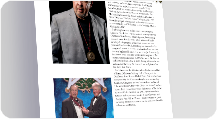 HARVEY PRATT EL RENO rom El Reno, Harvey Pratt is a self-taught artist Fwho works in oil, watercolor, metal, clay, and wood. His works include themes of Native American history and tradition and the Cheyenne people. A self-taught Oklahoma artist and Cheyenne and Arapaho Tribal Member, Pratt was selected to create the Smithsonian’s National Native American Veterans Memorial for the National Museum of the American Indian. Unveiled in 2020, “Warriors’ Circle of Honor” brings together 573 federally recognized tribes and is the only monument or memorial by an Oklahoman on the National Mall in Washington, D.C. Beginning his career in law enforcement with the Midwest City Police Department and retiring from the Oklahoma State Bureau of Investigation, Pratt’s career spanned more than 50 years. With Midwest City, he developed a fingerprint and records system and was promoted to detective. A nationally and internationally recognized expert in forensic art, Pratt has been involved in many high profile cases. He has brought closure to the families of loved ones and assisted in the capture of the most notorious criminals. A U. S. Marine in Air Rescue and Security from 1962 to 1965, during Vietnam he was stationed at Da Nang Air Base and rescued pilots who had been shot down. An inductee to the Oklahoma Law Enforcement Hall of Fame, Oklahoma Military Hall of Fame, and the Oklahoma State Bureau Hall of Fame, Pratt also has been recognized by the Cheyenne People as an outstanding Southern Cheyenne and was inducted as a traditional Cheyenne Peace Chief—the Cheyenne Nation’s highest honor. Pratt currently serves as chairperson of the Indian Arts and Crafts Board of the U.S. Department of the Interior and is past commander of the Cheyenne and Arapaho Post 401 in Clinton. Pratt continues to paint, including commission pieces, and his works are found in collections worldwide. JAMES R. “DICK” WILKERSON ATWOOD Former Oklahoma State Bureau of Investigation agent and State Senator, Wilkerson presented Harvey Pratt for induction. 4242