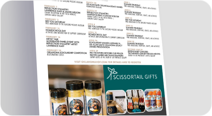 CALENDAR JANUARY 3 MARCH 1 MAY 13 OKLAHOMA SCHOLARSHIP COMPETITION OKLAHOMA HALL OF FAME CLASS OF 2023 SEE YOU SATURDAY REGISTRATION OPENS NOMINATION DEADLINE FREE ADMISSION TO THE GAYLORD-PICKENS MUSEUM JANUARY 10 MARCH 11 MAY 25 REFLECTION SYMMETRY: SEE YOU SATURDAY OKLAHOMA HALL OF FAME LAWRENCE NAFF & JASON WILSON FREE ADMISSION TO THE GAYLORD-PICKENS MUSEUM CLASS OF 2023 ANNOUNCEMENT EXHIBIT OPENS IN THE TULSA WORLD| MARCH 15-17 LORTON FAMILY GALLERY SPRING THING JANUARY 14 FREE ADMISSION AND ACTIVITIES JUNE 1 SEE YOU SATURDAY MARCH 24 SUMMER THURSDAY FREE ADMISSION TO THE GAYLORD-PICKENS MUSEUM LEE ALLAN SMITH OKLAHOMA LEGACY AWARD FREE ADMISSION, STORYTIME, CRAFTS, AND ACTIVITIES NOMINATION DEADLINE JUNE 8 FEBRUARY 2 MARCH 25 SUMMER THURSDAY REFLECTION SYMMETRY: REFLECTION SYMMETRY: FREE ADMISSION, STORYTIME, CRAFTS, AND ACTIVITIES LAWRENCE NAFF & JASON WILSON LAWRENCE NAFF & JASON WILSON JUNE 10 EXHIBIT RECEPTION IN THE TULSA WORLD| EXHIBIT CLOSES IN THE TULSA WORLD | SEE YOU SATURDAY LORTON FAMILY GALLERY LORTON FAMILY GALLERY FREE ADMISSION TO THE GAYLORD-PICKENS MUSEUM FEBRUARY 11 JUNE 15 SEE YOU SATURDAY APRIL 8 SUMMER THURSDAY FREE ADMISSION TO THE GAYLORD-PICKENS MUSEUM SEE YOU SATURDAY FREE ADMISSION, STORYTIME, CRAFTS, AND ACTIVITIES FEBRUARY 15 FREE ADMISSION TO THE GAYLORD-PICKENS MUSEUM HOMESCHOOL DAY APRIL 19 JUNE 22 ACTIVITIES AND INSTRUCTION TO SUPPORT CURRICULUM HOMESCHOOL DAY SUMMER THURSDAY ACTIVITIES AND INSTRUCTION TO SUPPORT CURRICULUM FREE ADMISSION, STORYTIME, CRAFTS, AND ACTIVITIES FEBRUARY 16 APRIL 26 JUNE 29 ARTIST TALK SCHOLARSHIP AWARDS ASSEMBLY & SUMMER THURSDAY MODERATED PANEL EVENT WITH LEE ALLAN SMITH OKLAHOMA LEGACY FREE ADMISSION, STORYTIME, CRAFTS, AND ACTIVITIES REFLECTION SYMMETRY ARTIST AWARD PRESENTATION LAWRENCE NAFF BEYOND JUNE 30 FEBRUARY 24 APRIL 29 EDITH KINNEY GAYLORD: OKLAHOMA SCHOLARSHIP COMPETITION NO FRONTIERS BEYOND OUR REACH: THE TWENTIETH CENTURY THROUGH HER EYES REGISTRATION CLOSES NATIVE AMERICAN CHANGEMAKERS EXHIBIT IN THE PRESIDENT’S OFFICE GALLERY EXHIBIT CLOSES IN THE STORY OF THE PORTRAITS GALLERY VISIT OKLAHOMAHOF.COM FOR DETAILS AND TO REGISTER 60