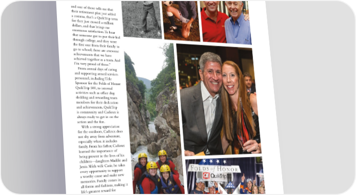 and one of those tells me that their retirement plan just added a comma, that’s a QuikTrip term for they just crossed a million dollars, and that brings me enormous satisfaction. To hear that someone got to put their kid through college, and they were the first one from their family to go to school, those are awesome achievements that we have achieved together as a team. And I’m very proud of those.” From annual days of caring and supporting armed services personnel, including Title Sponsor for the Folds of Honor QuikTrip 500, to internal activities such as office dog sledding and rewarding team members for their dedication and achievements, QuikTrip is community and Cadieux is always ready to get in on the action and the fun. With a strong appreciation for the outdoors, Cadieux does not shy away from adventure, especially when it includes family. From his father, Cadieux learned the importance of being present in the lives of his children—daughters Maddie and Jessie. With wife Casie, he takes every opportunity to support a worthy cause and make new memories. Family comes in all forms and fashions, making it life’s greatest reward for Chet Cadieux. 37 35