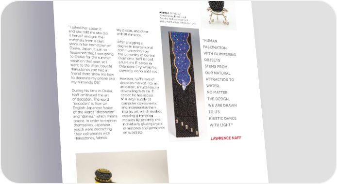 Egg I, 2”x1.5”x1.5,” Rhinestones and Lapis Lazuli, by Lawrence Naff. (Oklahoma Visual Arts Coalition) Azurite I, 24”x6”x1,” Rhinestones, Brass, and Azurite, by Lawrence Naff. (Oklahoma Visual Arts Coalition) “I asked her about it toy pieces, and other and she told me she did embellishments. “HUMAN it herself and got the materials from a craft After snagging a FASCINATION store in her hometown of degree in interpersonal WITH GLIMMERING Osaka, Japan. It just so communication from happened that I was going the University of Central OBJECTS to Osaka for the summer Oklahoma, Naff landed vacation that year, so I a full-time IT career in STEMS FROM went to the shop, bought Oklahoma City where he OUR NATURAL rhinestones and had a currently works and lives. friend there show me how ATTRACTION TO to decorate my phone and However, Naff’s love of my Nintendo DS.” decoden evolved into an WATER. art career, simultaneously During his time in Osaka, dovetailing with his IT NO MATTER Naff embraced the art career. He has access THE DESIGN, of decoden. The word to a large supply of “decoden” is from an computer components WE ARE DRAWN English-Japanese fusion and incorporates them of the words “decoration” into his art, which involves TO ITS and “denwa,” which means creating glimmering KINETIC DANCE phone. In order to express mosaics by patiently and themselves, Japanese individually glueing crystal WITH LIGHT.” youth were decorating rhinestones and gemstones their cell phones with on substrate. rhinestones, fabrics, LAWRENCE NAFF Justice, Crystal, Tiger’s Eye, and Brass, by Lawrence Naff. (Oklahoma Visual Arts Coalition) 5 5