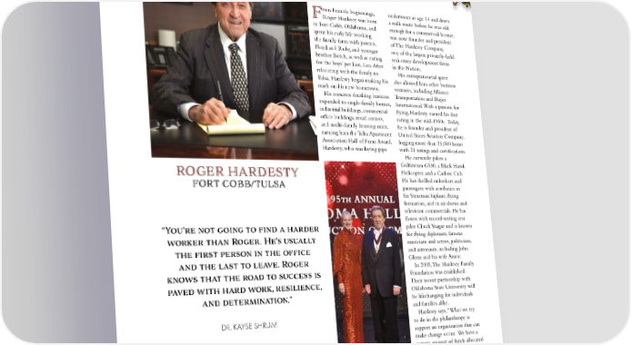 rom humble beginnings, underwater at age 14 and drove FRoger Hardesty was born a milk route before he was old in Fort Cobb, Oklahoma, and enough for a commercial license, spent his early life working was now founder and president the family farm with parents, of The Hardesty Company, Floyd and Ruby, and younger one of the largest privately-held brother Butch, as well as caring real estate development firms for the boys’ pet lion, Leo. After in the Nation. relocating with the family to His entrepreneurial spirit Tulsa, Hardesty began making his also allowed him other business mark on his new hometown. ventures, including Alliance His concrete finishing business Transportation and Bizjet expanded to single-family homes, International. With a passion for industrial buildings, commercial flying, Hardesty earned his first office buildings, retail centers, rating in the mid-1950s. Today, and multi-family housing units, he is founder and president of earning him the Tulsa Apartment United States Aviation Company, Association Hall of Fame Award. logging more than 15,000 hours Hardesty, who was laying pipe with 21 ratings and certifications. He currently pilots a Gulfstream G550, a Black Hawk ROGER HARDESTY Helicopter, and a Carbon Cub. FORT COBB/TULSA He has thrilled onlookers and passengers with acrobatics in his Stearman biplane, flying formation, and in air shows and television commercials. He has flown with record-setting test “You’re not going to find a harder pilot Chuck Yeagar and is known worker than Roger. He’s usually for flying diplomats, famous musicians and actors, politicians, the first person in the office and astronauts, including John and the last to leave. Roger Glenn and his wife Annie. knows that the road to success is In 2005, The Hardesty Family Foundation was established. paved with hard work, resilience, Their recent partnership with and determination.” Oklahoma State University will be lifechanging for individuals and families alike. DR. KAYSE SHRUM Hardesty says, “What we try to do in the philanthropy is support an organization that can make change occur. We have a certain amount of funds allocated to support the needy that need to eat and have shelter. But the Dr. Kayse Shrum, left, presented Roger Hardesty for induction to the Oklahoma Hall of Fame. 40