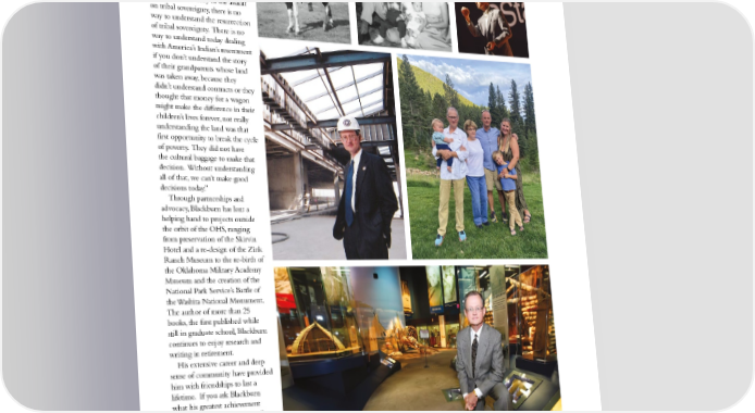 learn from our history. So in terms of tribal sovereignty today, and state relationship, tribal relationship, with federal relationship, with local governments, if you don’t understand the story of the assault on tribal sovereignty, there is no way to understand the resurrection of tribal sovereignty. There is no way to understand today dealing with America’s Indian’s resentment if you don’t understand the story of their grandparents whose land was taken away, because they didn’t understand contracts or they thought that money for a wagon might make the difference in their children’s lives forever, not really understanding the land was that first opportunity to break the cycle of poverty. They did not have the cultural baggage to make that decision. Without understanding all of that, we can’t make good decisions today.” Through partnerships and advocacy, Blackburn has lent a helping hand to projects outside the orbit of the OHS, ranging from preservation of the Skirvin Hotel and a re-design of the Zink Ranch Museum to the re-birth of the Oklahoma Military Academy Museum and the creation of the National Park Service’s Battle of the Washita National Monument. The author of more than 25 books, the first published while still in graduate school, Blackburn continues to enjoy research and writing in retirement. His extensive career and deep sense of community have provided him with friendships to last a lifetime. If you ask Blackburn what his greatest achievement is, he will tell you it is his family. With wife Debbie, a former teacher, non-profit CEO, and state legislator, they are the proud parents of son Beau and daughter- in-law Tori. And, Blackburn is thrilled with his new title— Papa—given to him by grandsons Bodhi and Waylon. 35