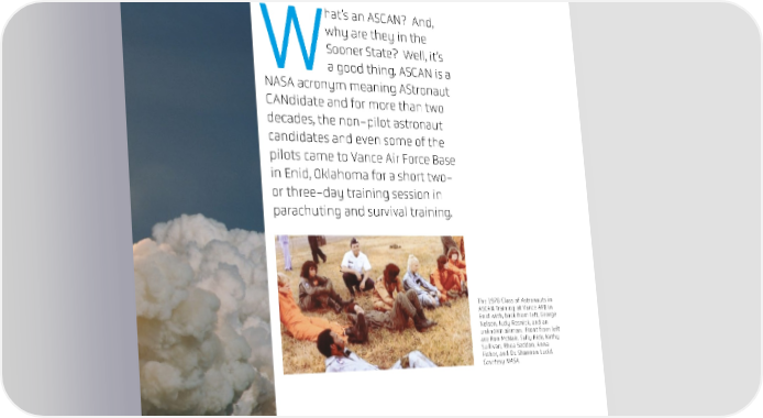 hat’s an ASCAN? And, why are they in the Sooner State? Well, it’s Wa good thing. ASCAN is a NASA acronym meaning AStronaut CANdidate and for more than two decades, the non-pilot astronaut candidates and even some of the pilots came to Vance Air Force Base in Enid, Oklahoma for a short two- or three-day training session in parachuting and survival training. The 1978 Class of Astronauts in ASCAN Training at Vance AFB in Enid with, back from left, George Nelson, Judy Resnick, and an unknown airman. Front from left are Ron McNair, Sally Ride, Kathy Sullivan, Rhea Seddon, Anna Fisher, and Dr. Shannon Lucid. Courtesy NASA. The goal of all the ASCAN was to fly into space on the Space Shuttle. Courtesy NASA. 15 35