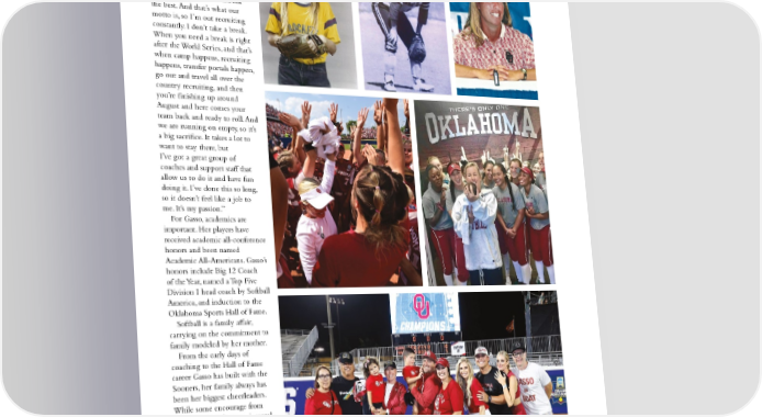 say ‘you’re the best’. So to be the best, you have to outwork the best. And that’s what our motto is, so I’m out recruiting constantly. I don’t take a break. When you need a break is right after the World Series, and that’s when camp happens, recruiting happens, transfer portals happen, go out and travel all over the country recruiting, and then you’re finishing up around August and here comes your team back and ready to roll. And we are running on empty, so it’s a big sacrifice. It takes a lot to want to stay there, but I’ve got a great group of coaches and support staff that allow us to do it and have fun doing it. I’ve done this so long, so it doesn’t feel like a job to me. It’s my passion.” For Gasso, academics are important. Her players have received academic all-conference honors and been named Academic All-Americans. Gasso’s honors include Big 12 Coach of the Year, named a Top Five Division I head coach by Softball America, and induction to the Oklahoma Sports Hall of Fame. Softball is a family affair, carrying on the commitment to family modeled by her mother. From the early days of coaching to the Hall of Fame career Gasso has built with the Sooners, her family always has been her biggest cheerleaders. While some encourage from the sidelines, others are integral members of the coaching staff. The Gasso family is all for one and one for all, regardless of the demands or schedules, allowing dreams realized for legendary coach Patty Gasso. 3939 35