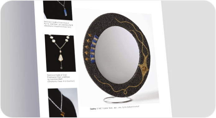 Necklace made of Lapis Lazuli, Pyrite, and Steel, by Lawrence Naff. (Oklahoma Visual Arts Coalition) Necklace made of Shell, Freshwater Pearl, and Steel, by Lawrence Naff. (Oklahoma Visual Arts Coalition) Destiny, 12”x12,” Crystal, Glass, Lapis Lazuli, Pyrite, by Lawrence Naff. Necklace made of Tiger’s Eye and Steel, by Lawrence Naff. (Oklahoma Visual Arts Coalition) 77 35