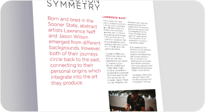 REFLECTION SYMMETRY LAWRENCE NAFF Born and bred in the Now a visual artist and characters with rings that jewelry designer, Lawrence possessed powers that Naff was born in and grew could control the elements, Sooner State, abstract up in Oklahoma City. His and the video game ‘Sonic mother was a software the Hedgehog’ had the artists Lawrence Naff specialist and his father a Chaos Emeralds which sales professional. During gave him super powers. and Jason Wilson Naff’s youth, he held no This caused me to be inclination toward art. But interested in crystals in he was passionate about elementary school.” emerged from different geology, especially crystals and minerals, and video After graduating from backgrounds. However, games and anime. Oklahoma City’s Northeast Academy for Health both of their journeys “During the 1980s and Sciences and Engineering, 1990s, I was consuming Naff entered university circle back to the past, entertainment that life. At that point, his centered around a theme childhood love of crystals of magical crystals,” and minerals connected connecting to their 36-year-old Naff says. with a new experience that “‘Sailor Moon’ had a tapped into his previously- personal origins which storyline centered on a hidden artistic abilities. magical silver crystal and integrate into the art the villains were named “In college, a friend, who after gemstones and was from Japan, had minerals. ‘Captain Planet her iPad decorated with they produce. and the Planeteers’ had rhinestones,” Naff says. LAWRENCE NAFF: 1515 Lincoln Gallery, 1515 North Lincoln, Oklahoma City; lawrencenaff.com; and Instagram @lawrencenaff. Lawrence Naff demonstrates his visual art methods. (Oklahoma Visual Arts Coalition) 4