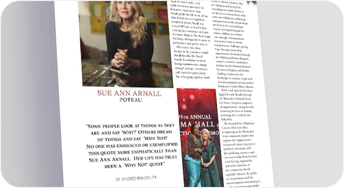 rowing up in Poteau at leaders to discuss initiatives that the onset of the civil are changing and saving lives, G rights movement provided for expanding successful reforms to formative experiences that social services systems from other would guide the life work of Sue states into Oklahoma, addressing Ann Arnall. An accomplished transportation needs of individuals saxophone player, Arnall was involved in the criminal legal named All State in band before system and supporting parents earning her economics and juris whose children are in foster doctorate degrees. She then began care through a Transportation building a distinguished career of Innovation Grant to thwart professional and public service. transportation challenges, giving After more than three hope through mentorship decades in the corporate world, opportunities for families through Arnall founded the Arnall the Oklahoma Partner Program, Family Foundation to create created a women’s community lasting transformative change kitchen for the Firststep Women’s through strategic investments Recovery Program, and funded and innovative partnerships. building construction for She is bringing together world ReMerge to continue its pre-trial diversion program serving mothers facing non-violent felony offenses. With a soft spot for her four- SUE ANN ARNALL legged friends, Arnall, through POTEAU the Wastershed Animal Fund, has been a longtime supporter of organizations caring for and bettering the lives of animals, including the Coalition for Tulsa Pets. “Some people look at things as they She founded the Oklahoma are and say ‘Why?’ Others dream County Diversion Hub, recognizing at the Wayfinders of things and say ‘Why Not!’ Gala community leaders that No one has embraced or exemplified support the organization’s mission of connecting justice- this quote more emphatically than involved individuals with Sue Ann Arnall. Her life has truly life stabilizing resources and been a ‘Why Not’ quest.” services to help them become contributing, responsible, and stable members of DR. MILDRED RANDOLPH the community. Arnall regularly educates the public on incarceration and the misconceptions surrounding it. “Incarcerating more people does not create public safety, it does the opposite. When a person is incarcerated beyond the Dr. Mildred Randolph, left, amount of time for rehabilitation, presented Sue Ann Arnall it changes their chances when for induction to the Oklahoma Hall of Fame. 32