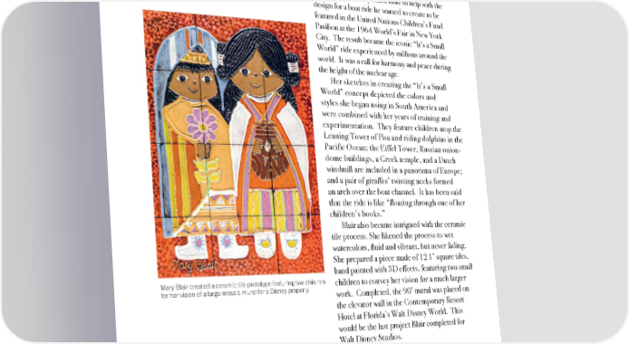 In 1963, Disney asked Blair to help with the design for a boat ride he wanted to create to be featured in the United Nations Children’s Fund Pavilion at the 1964 World’s Fair in New York City. The result became the iconic “It’s a Small World” ride experienced by millions around the world. It was a call for harmony and peace during the height of the nuclear age. Her sketches in creating the “It’s a Small World” concept depicted the colors and styles she began using in South America and were combined with her years of training and experimentation. They feature children atop the Leaning Tower of Pisa and riding dolphins in the Pacific Ocean; the Eiffel Tower, Russian onion- dome buildings, a Greek temple, and a Dutch windmill are included in a panorama of Europe; and a pair of giraffes’ twisting necks formed an arch over the boat channel. It has been said that the ride is like “floating through one of her children’s books.” Blair also became intrigued with the ceramic tile process. She likened the process to wet watercolors, fluid and vibrant, but never fading. She prepared a piece made of 12 1’ square tiles, hand painted with 3D effects, featuring two small Mary Blair created a ceramic tile prototype featuring two children children to convey her vision for a much larger for her vision of a large mosaic mural for a Disney property. work. Completed, the 90’ mural was placed on the elevator wall in the Contemporary Resort Hotel at Florida’s Walt Disney World. This would be the last project Blair completed for Walt Disney Studios. 4040