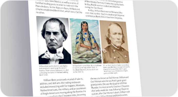 Charles worked for the Missouri Fur Company. The Bent brothers’ personal lives were After involvement in fur trading and a stint in the interwoven into the fabric of their entrepreneurial military, he and William took goods from St. Louis endeavors. Charles married Maria Ignacia Jaramillo to Santa Fe, creating mercantile contacts, starting in Taos. Maria’s younger sister, Josefa, later married a series of trading trips over the Santa Fe Trail, and Kit Carson. Appointed as the first civilian governor partnering with another trader. They established of New Mexico Territory, Charles met a grisly death. a store in Taos, New Mexico, as well as a series of In 1847, Pueblo warriors scalped and killed him fortified trading posts in order to trade with the during the Taos Revolt. Plains Indians. In the 1830s or 1840s, William and In 1835, William Bent married Mistanta (Mis- Charles established Bent’s Fort, which was a fort like stan-stur, ca. 1810-1847) in a traditional Cheyenne no other. ceremony at Bent’s Fort. A Southern Cheyenne, William Bent and his brother were highly William Bent married Mistanta in a traditional William Bent's brother Charles married Maria instrumental in opening up the western Cheyenne ceremony at Bent's Fort. A Ignacia Jaramillo. Maria's younger sister, Josefa, frontier. Their massive endeavors included Southern Cheyenne, she was also known married Kit Carson, William Bent's good cultivating the Santa Fe Trail and building as Owl Woman. friend. Carson was a frontiersman, trapper, Bent's Fort. guide, and Indian agent. William Bent possessed a myriad of talents, she was also known as Owl Woman. William and abilities, and skill sets. His trading endeavors Owl Woman were Harvey Pratt’s great-great- included interacting with fur trappers, Mexicans, grandparents. She was the daughter of White Native Americans, the military, and an assortment Thunder, the most powerful Southern Cheyenne of Anglo Americans moving along the frontier. He chief and a medicine man. Following Cheyenne was accepted into the Cheyenne tribe, becoming custom, after Owl Woman’s death, William took a sub chief. William was an interpreter, and he also her sisters Yellow Woman and Island as wives. served as a mediator among the Cheyenne and White Thunder, Harvey Pratt’s great-great- other Native American nations, and negotiated great-grandfather, held the sacred and prominent peace among various tribes. As well, he negotiated position of “Keeper of the Arrows.” Consisting of between Native American groups and the U.S. four arrows, he kept the bundle, which included two government. William also served as a military scout. arrows for defense and two for hunting, all of which 17 35