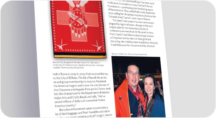 Often soft spoken, he is diplomatic, but usually speaks to the truth and directly to the point of the matter at hand. He and his wife Gina live in Logan County. And they’re not sitting in neutral. The Sand Creek Memorial Project has been stuck in idle since its inception in 2014. One Earth Future Foundation is spearheading the fundraising aspect of the memorial. They called Pratt in early September 2020, telling him the project may have a home on the Colorado State Capitol’s west steps in Denver. The Sand Creek project has been and remains plagued by logistical issues, changes in Harvey’s original plan for the memorial, and a lot of controversy on every level. At this point in time, Pratt’s Sand Creek Memorial prototype involves a Cheyenne mother who is in deep grief and mourning. Her child has been murdered in the Sand Creek Massacre. For the seven inch by nine inch Harvey and Gina Pratt. Photo courtesy Harvey Pratt. Harvey Pratt designed a Pendleton blanket for Oklahoma's Centennial. The blankets were a limited edition and are no longer available. Photo courtesy Harvey Pratt. Hall of Fame in 2019. In 2019, Pratt received the key to the City of El Reno. The list of boards he serves on and group memberships is massive. He joined the American Legion and is now the commander of the Cheyenne and Arapaho Post 401 in Clinton. And he’s the chairperson for the Department of Interior Indian Arts and Crafts Board, and tells, “We’ve seized millions of dollars of counterfeit Native American jewelry.” But a law enforcement career accumulates a lot of dark baggage, and Pratt found his solitude in art. Now an award-winning and self-taught, master artist, he uses oil, acrylic, water colors, metal, clay, and wood. He was named Red Earth 2005 Honored One. And his paintings are sold globally. Despite all the accolades and awards, Harvey Pratt is a humble person, fully aware of how his life today is an extension of his ancestral bloodlines. 2626