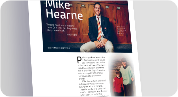 THIS IS OKLAHOMA: Mike Hearne Mike Hearne at “People don’t want to leave Southerndown here. Or if they do, they most Gold Club in his Welsh Men’s likely come back.” Team blazer. —MIKE HEARNE BY GINI MOORE CAMPBELL erhaps you have heard a This is Oklahoma podcast. Maybe Pyou have seen a post by This is Oklahoma with one of the many beautiful landscapes Oklahoma has to offer. But do you know the unique story of the Oklahoma- transplant who created the brand? Mike Hearne, born and raised in Bridgend, Wales, is the man behind the mic and the lens. The elder son born to Steve and Jennifer Hearne and older brother by five years to Lewis, Mike Hearne played one game of Wales’ national sport—rugby, but after getting hurt decided never to play again. He played a lot of football A young Mike Hearne with his grandfather, (soccer), but believed he was Ted Jones, at Southerndown Golf Club in only “decent,” never “amazing.” Wales. Hearne’s grandfather gave him his first golf club and sparked his interest in However, at the age of six his the sport. 42