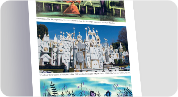 On the deck of the Jolly Roger, Peter Pan and Captain Hook have their finale fight in a concept painting by Mary Blair. “It’s a Small World” opened at Disneyland in May, 1966 based on the design by Mary Blair for the 1964 World’s Fair in New York City, New York. Mary Blair’s concept painting of mermaids, each in a different color palette to convey personality and mood, graced the cover and interior of Walt Disney’s Peter Pan by Dave Barry and Ridley Pearson. 39 35 39