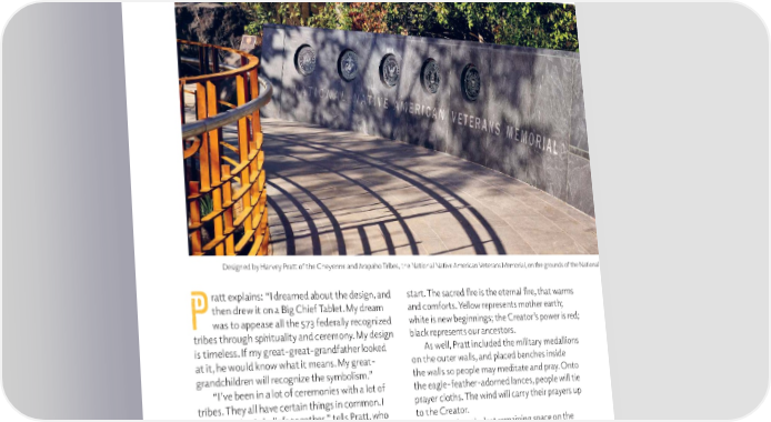 Designed by native Oklahoman and award-winning Cheyenne and Arapaho artist Harvey Pratt, the National Native American Veterans Memorial was commissioned by the U.S. Congress. More than 85 tribes, individuals, corporations, and other organizations contributed to the memorial. It is the only memorial or monument, on the National Mall in Washington, D.C., designed by an Oklahoman. Designed by Harvey Pratt of the Cheyenne and Arapaho Tribes, the National Native American Veterans Memorial, on the grounds of the National Museum of the American Indian in Washington, D.C., November 2020. Photo by Alan Karchmer for the National Museum of the American Indian ratt explains: “I dreamed about the design, and start. The sacred fire is the eternal fire, that warms then drew it on a Big Chief Tablet. My dream and comforts. Yellow represents mother earth; Pwas to appease all the 573 federally recognized white is new beginnings; the Creator’s power is red; tribes through spirituality and ceremony. My design black represents our ancestors. is timeless. If my great-great-grandfather looked As well, Pratt included the military medallions at it, he would know what it means. My great- on the outer walls, and placed benches inside grandchildren will recognize the symbolism.” the walls so people may meditate and pray. Onto “I’ve been in a lot of ceremonies with a lot of the eagle-feather-adorned lances, people will tie tribes. They all have certain things in common. I prayer cloths. The wind will carry their prayers up put those basic beliefs together,” tells Pratt, who to the Creator. grew up in a traditional, Cheyenne-Arapaho family. Located on the last remaining space on the Of his design, he describes that all of life is a circle, National Mall in Washington, D.C., the memorial including the cycles of life and seasons. Pratt includes a 14’ tall and 50’ wide stainless steel, included sacred water that makes things grow and granite, and bronze structure. Pratt’s wife Gina says, 14