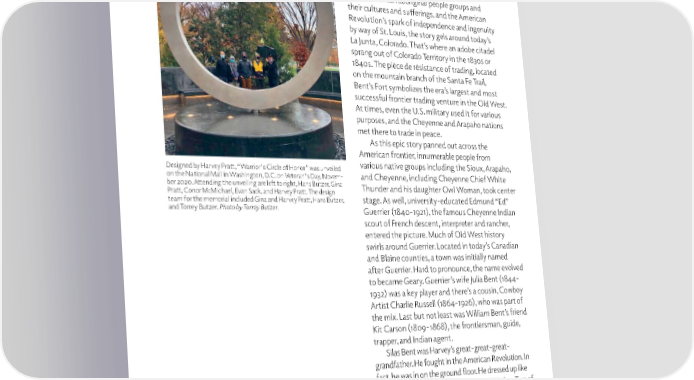 ratt is part of a rich, colorful heritage and creative bloodline that merged and sprang Pforth from the Arkansas River area in southeastern Colorado Territory. Born of the North American aboriginal people groups and their cultures and sufferings, and the American Revolution’s spark of independence and ingenuity by way of St. Louis, the story gels around today’s La Junta, Colorado. That’s where an adobe citadel sprang out of Colorado Territory in the 1830s or 1840s. The pièce de résistance of trading, located on the mountain branch of the Santa Fe Trail, Bent’s Fort symbolizes the era’s largest and most successful frontier trading venture in the Old West. At times, even the U.S. military used it for various purposes, and the Cheyenne and Arapaho nations met there to trade in peace. As this epic story panned out across the American frontier, innumerable people from Designed by Harvey Pratt, “Warrior's Circle of Honor” was unveiled various native groups including the Sioux, Arapaho, on the National Mall in Washington, D.C. on Veteran's Day, Novem- and Cheyenne, including Cheyenne Chief White ber 2020. Attending the unveiling are left to right, Hans Butzer, Gina Thunder and his daughter Owl Woman, took center Pratt, Conor McMichael, Evan Sack, and Harvey Pratt. The design team for the memorial included Gina and Harvey Pratt, Hans Butzer, stage. As well, university-educated Edmund “Ed” and Torrey Butzer. Photo by Torrey Butzer. Guerrier (1840-1921), the famous Cheyenne Indian scout of French descent, interpreter and rancher, entered the picture. Much of Old West history swirls around Guerrier. Located in today’s Canadian and Blaine counties, a town was initially named after Guerrier. Hard to pronounce, the name evolved to became Geary. Guerrier’s wife Julia Bent (1844- 1932) was a key player and there’s a cousin, Cowboy Artist Charlie Russell (1864-1926), who was part of the mix. Last but not least was William Bent’s friend Kit Carson (1809-1868), the frontiersman, guide, trapper, and Indian agent. Silas Bent was Harvey’s great-great-great- grandfather. He fought in the American Revolution. In fact, he was in on the ground floor. He dressed up like an Indian and threw the tea into Boston Harbor. Two of his eleven children were Charles Bent (1799-1847) and William Bent (1809-1869), who headed west from St. Louis. To this day, they’re known as the brothers who helped open the West and the Santa Fe Trail. 16