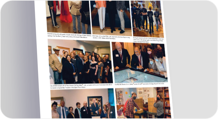 OHOF’S STORY THROUGH ITS PEOPLE Artist DG Smalling visits with guests during the reception for The Visage of Modern Matriarchy Jonna Kauger, left, and Kyle Shifflett, right, congratulate Justice Yvonne Kauger on being Fourth grade students from Del City’s Christian Heritage Academy learned about opening in the Tulsa World | Lorton Family Gallery at the Gaylord-Pickens Museum. selected as a 2021 Oklahoma Hall of Fame Honoree. Charlie Christian while viewing his guitar in the Oklahoma Through Its People Gallery at the Gaylord-Pickens Museum. Class of 2020 Oklahoma Hall of Fame Honoree Chief Gary Batton , center, surrounded by family and friends who came to celebrate From left, 2020 Honorees Calvin J. Anthony and John W. Smith share elements of the Legacy Map with Smith’s children. his induction during the May 4 reception at the Gaylord-Pickens Museum. The family of Oklahoma Hall of Fame Honoree Calvin J. Anthony , fifth from left, admired his portrait in the Oklahoma Hall of Fame Gallery. Bradley Fritch, left, and Emma Leach prepare boxes of classroom supplies and activities for students in southeastern Oklahoma thanks Denotes Member of the Oklahoma Hall of Fame to a grant from the Carolyn Watson Rural Oklahoma County Community Foundation. 60