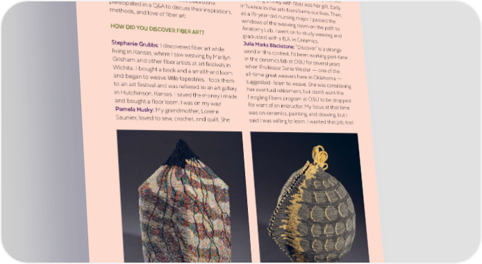 will ensure that the legacy of fiber art and the introduced me to skills of sewing and cutting generations of women behind it will continue in folded accordion paper when I was 5 years old. Oklahoma well into the future. Stephanie Grubbs, My lifelong affinity with fiber was her gift. Early Pamela Husky, and Julia Marks Blackstone influence in the arts transforms our lives. Then, participated in a Q&A to discuss their inspirations, as a 19-year-old nursing major, I passed the methods, and love of fiber art: windows of the weaving room on the path to Anatomy Lab. I went on to study weaving and HOW DID YOU DISCOVER FIBER ART? graduated with a B.A. in Ceramics. Julia Marks Blackstone: “Discover” is a strange Stephanie Grubbs: I discovered fiber art while word in this context. I’d been working part-time living in Kansas, where I saw weaving by Marilyn in the ceramics lab at OBU for several years Grisham and other fiber artists at art festivals in when Professor Janie Wester — one of the Wichita. I bought a book and a small hand loom all-time great weavers here in Oklahoma — and began to weave little tapestries. I took them suggested I learn to weave. She was considering to an art festival and was referred to an art gallery her eventual retirement, but didn’t want the in Hutchinson, Kansas. I saved the money I made fledgling fibers program at OBU to be dropped and bought a floor loom. I was on my way! for want of an instructor. My focus at that time Pamela Husky: My grandmother, Lorene was on ceramics, painting, and drawing, but I Saunier, loved to sew, crochet, and quilt. She said I was willing to learn. I wanted that job, too! Stephanie Grubbs, Melting Pot, Stephanie Grubbs, Interrupted, Double Half Hitch Knots of Cotton Thread and Waxed Linen, Double Half Hitch Knots of Cotton Thread and Waxed Linen, 10 x 5 ½ x 5 ½. Photo courtesy Stephanie Grubbs. 9 x 6 x 7. Photo courtesy Stephanie Grubbs. 8