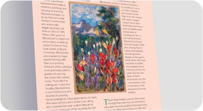 Julie Marks Blackstone, Assistant Professor has continued, earning her the Distinguished of Art at Oklahoma Baptist University (OBU) in Teaching Award from OBU in 2019, the highest Shawnee, started her journey towards fiber art at academic honor the university has to offer. the suggestion of OBU Professor Janie Wester, Blackstone teaches a variety of mediums a master rug weaver. as a professor, but as Interested primarily in an artist is perhaps ceramics, painting, and best known for her drawing at the time, fiber work. Her “Knotty Blackstone began to Girl” series, created study fiber art under using a French Knot Wester’s mentorship embroidery technique and eventually with embellishments, began teaching full- are portraits of time at OBU in 1981. inspiring women. In When OBU paid for her historical series, Blackstone to attend an Blackstone portrays embroidery workshop historical figures, while under Professor Mary also utilizing fiber to Ruth Smith at Baylor create color palettes University, Blackstone and recognizable was inspired to begin designs in homage to experimenting with other artists. Her work fiber as a primary has been accepted medium while utilizing a into multiple shows, more painterly palette, including Fiberworks, greatly influencing where she has won the works she creates “Best of Show” today. Much like her three times, and the colleagues Husky and Handweavers Guild Grubbs, Blackstone is of America’s Small a committed educator, Expressions touring devoted to passing exhibits. her knowledge to future generations of artists. She views art education as her true calling, hese three brilliant, women fiber artists, and considers her own work in fiber art an Tthrough their steadfast commitment to important extension of her teaching. By 1997 education, have ensured that the long history Blackstone was teaching ceramics, stained of fiber art will be remembered. Further, the glass, color theory, figure drawing, and fiber art. connections they have carefully weaved between Her dedication to education and her students one another and the broader community Pamela Husky, Rocky Mountain Wildflowers, Hand Dyed, Spun, and Felted Wool and Silk, 55 x 38. Photo courtesy Pamela Husky. 77 35