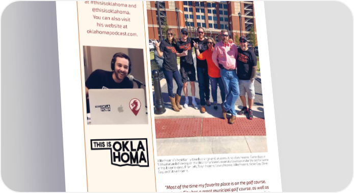 Follow Mike Hearne and This is Oklahoma at #thisisoklahoma and @thisisoklahoma. You can also visit his website at oklahomapodcast.com. Mike Hearne’s host family bleeds orange and, as a result, so does Hearne. Game days in Stillwater and cheering on the Oklahoma State University Cowboys make the list for some of his favorite days. From left, Taryn Hearne, Lewis Hearne, Mike Hearne, Vickie Guy, Dave Guy, and Steve Hearne. “Most of the time my favorite place is on the golf course, Oklahoma City has a great municipal golf course, as well as world class country club courses. The Patriot in Owasso is a cool spot, I haven’t played Southern Hills or Karsten Creek yet, but I’ve heard unreal things.” —MIKE HEARNE 48