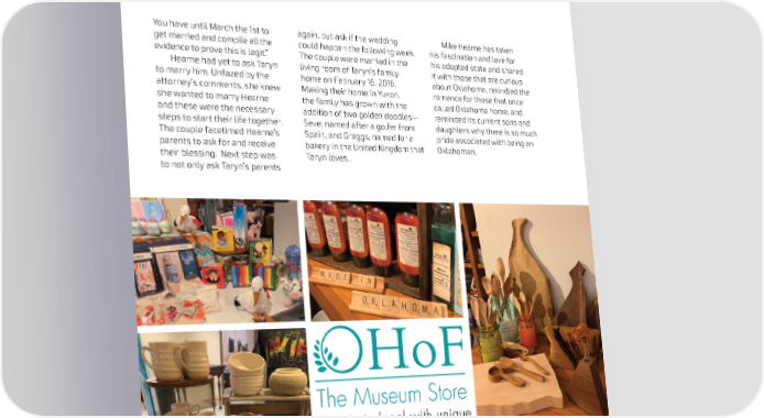 “Starting this summer, This is Oklahoma will feature the best homes in the state, from historical mansions and luxury cabins to modern masterpieces. Taking full advantage of Mike’s real estate background, This is Oklahoma will take you on a tour through Oklahoma’s most desired homes.” —MIKE HEARNE You have until March the 1st to again, but ask if the wedding Mike Hearne has taken get married and compile all the could happen the following week. his fascination and love for evidence to prove this is legit.” The couple were married in the his adopted state and shared Hearne had yet to ask Taryn living room of Taryn’s family it with those that are curious to marry him. Unfazed by the home on February 16, 2016. about Oklahoma, rekindled the attorney’s comments, she knew Making their home in Yukon, romance for those that once she wanted to marry Hearne the family has grown with the called Oklahoma home, and and these were the necessary addition of two golden doodles— reminded its current sons and steps to start their life together. Seve, named after a golfer from daughters why there is so much The couple facetimed Hearne’s Spain, and Greggs, named for a pride associated with being an parents to ask for and receive bakery in the United Kingdom that Oklahoman. their blessing. Next step was Taryn loves. to not only ask Taryn’s parents Lean in to local with unique "Made in Oklahoma" items Located inside the Gaylord-Pickens Museum 1400 Classen Drive Oklahoma City, OK 73106 49 35 Tues.-Fri. 10-5 & Sat. 9-2