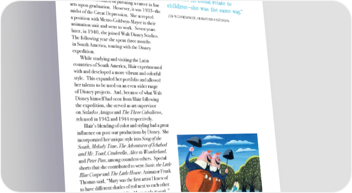 “The way she painted—in a lot of ways she was still a little girl. Walt [Disney] was like that. You could see he could relate to Blair had dreamed of pursuing a career in fine children—she was the same way.” arts upon graduation. However, it was 1933—the JOHN CANEMAKER, ANIMATION HISTORIAN midst of the Great Depression. She accepted a position with Metro-Goldwyn-Mayer in their animation unit and went to work. Seven years later, in 1940, she joined Walt Disney Studios. The following year she spent three months in South America, touring with the Disney expedition. While studying and visiting the Latin countries of South America, Blair experimented with and developed a more vibrant and colorful style. This expanded her portfolio and allowed her talents to be used on an even wider range of Disney projects. And, because of what Walt Disney himself had seen from Blair following the expedition, she served as art supervisor on Saludos Amigos and The Three Caballeros, released in 1942 and 1944 respectively. Blair’s blending of color and styling had a great influence on post-war productions by Disney. She incorporated her unique style into Song of the South, Melody Time, The Adventures of Ichabod and Mr. Toad, Cinderella, Alice in Wonderland, and Peter Pan, among countless others. Special shorts that she contributed to were Susie, the Little Blue Coupe and The Little House. Animator Frank Thomas said, “Mary was the first artist I knew of to have different shades of red next to each other. You just didn’t do that! But Mary made it work.” Alice in Wonderland’s Tweedledee and Tweedledum concept painting by Mary Blair. 37 35