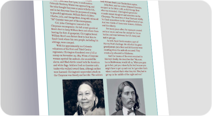 Sand Creek Massacre A large number of the Cheyenne were camped took William Bent’s son Charles Bent captive. on Sand Creek near Fort Lyon, in southeastern Julia Bent, and her suitor Edmund Guerrier, Colorado Territory. Winter was approaching, and escaped in the bitter cold, as did George Bent the tribe thought they were at peace with the U.S., who was wounded. Chivington’s genocidal and in fact they were there for purposes of coming crusade rained slaughter and atrocities on the to peaceful agreements. William Bent’s children Cheyenne. The numbers of dead fluctuate wildly, Charles, Julia, and George Bent, along with Edmund but land somewhere in the neighborhood of 230. “Ed” Guerrier were part of the encampment. And two-thirds of them were women, children, Col. John Chivington learned of the and the elderly. Cheyenne encampment. He left armed guards at For many years after, the massacre created Bent’s Fort to keep William Bent and others from serious issues and was the catalyst for future leaving the fort. At gunpoint, Chivington forced battles and wars between the U.S. Army and William Bent’s son Robert Bent to lead him to native groups. Sand Creek where his own people, including his As well, Sand Creek remains a part of siblings, were camped. Harvey Pratt’s heritage. He tells that his great- With his approximately 700 Colorado grandparents Julia Bent and Ed Guerrier were volunteers of the First and Third Cavalry courting when the ambush occurred. They regiments, Chivington thundered over a hill at eventually relocated to Oklahoma. sunup on November 29, 1864. When a Cheyenne And the trauma of the event remained in woman spotted the ambush, she sounded the Harvey’s family. He describes that “My aunt, alarm, and Black Kettle raised both the American Laura Birdwoman, would tell us, ‘When you guys and white flags. Soldiers fired on Guerrier and a go to bed, put your shoes by the bed because you trader who walked toward them, although neither might have to get up and run.’ As I got older that’s were harmed. Chivington’s unprovoked attack on when I realized that’s what they did. They had to the Cheyenne was bloody and horrific. The soldiers get up in the middle of the night and run.” Anna Guerrier Pratt Shadlow was an award- The French-Cheyenne scout and interpreter Edmund winning cultural teacher and story teller. Guerrier married William Bent's daughter Julia. Edmund and Photo courtesy Harvey Pratt. Julia survived the Sand Creek Massacre. Geary, Oklahoma, is named after Edmund.