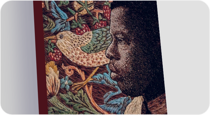 Julie Marks Blackstone, If Kehinde Worked in Thread, Embroidery, Cotton Floss, 6 ½ x 6 ½. A portrait of young John Lewis, with nods to Kehinde Wiley and William Morris. Photo courtesy Julie Marks Blackstone. 5
