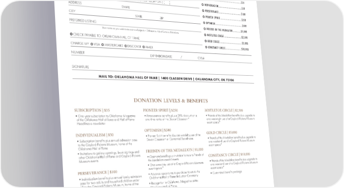 GAYLORD-PICKENS MUSEUM YES! I WOULD LIKE TO SUPPORT THE OKLAHOMA HALL OF FAME. MR./MRS./DR./MS. SUBSCRIPTION .....................................$35 SPOUSE PREFERRED TELEPHONE ( ) INDIVIDUALISM ....................................$50 PERSEVERANCE ..................................$100 ADDRESS EMAIL PIONEER SPIRIT .................................$250 CITY STATE ZIP OPTIMISM .........................................$500 PREFERRED LISTING FRIENDS OF THE MEDALLION ............$1,000 Your name as you wish to be acknowledged in Oklahoma Hall of Fame publications. MISTLETOE CIRCLE ..........................$2,500 CHECK PAYABLE TO: OKLAHOMA HALL OF FAME GOLD CIRCLE ..................................$5,000 CONSTANCY CIRCLE........................ $10,000 CHARGE MY VISA MASTERCARD DISCOVER AMEX NUMBER EXPIRATION DATE / CVV# SIGNATURE MAIL TO: OKLAHOMA HALL OF FAME | 1400 CLASSEN DRIVE | OKLAHOMA CITY, OK 73106 DONATION LEVELS & BENEFITS SUBSCRIPTION | $35 PIONEER SPIRIT | $250 MISTLETOE CIRCLE | $2,500 •One-year subscription to Oklahoma: Magazine •Perseverance benefits plus a 25% discount on a •Friends of the Medallion benefits plus upgrade to of the Oklahoma Hall of Fame and Hall of Fame one-time rental of the Devon Classroom* one weeknight use of a Gaylord-Pickens Museum Headlines e-newsletter event space* INDIVIDUALISM | $50 OPTIMISM | $500 GOLD CIRCLE | $5,000 •Pioneer Spirit benefits plus one weekday use of the •Subscription benefits plus annual admission pass Devon Classroom or Centennial Boardroom •Friends of the Medallion benefits plus upgrade to to the Gaylord-Pickens Museum, home of the one weekend use of a Gaylord-Pickens Museum Oklahoma Hall of Fame event space* •Invitations to gallery openings, book signings and FRIENDS OF THE MEDALLION | $1,000 other Oklahoma Hall of Fame and Gaylord-Pickens •Optimism benefits plus invitation for two to Friends of CONSTANCY CIRCLE | $10,000 Museum events the Medallion special events •One weekday use of a Gaylord-Pickens Museum •Friends of the Medallion benefits plus upgrade to PERSEVERANCE | $100 event space* one weekend use of a Gaylord-Pickens Museum event space* •Individualism benefits plus annual family admission •Advance opportunity to purchase tickets to the •Customized benefits package pass for two adults and household children under Oklahoma Hall of Fame Induction Ceremony 18 to the Gaylord-Pickens Museum, home of the •Recognition in Oklahoma: Magazine of the Oklahoma Hall of Fame Oklahoma Hall of Fame. *Event space must be used within one year of contribution and is subject to availability; additional fees may apply For more information about any of our donor levels or to customize your donor package at the $10,000 level and above, call Breann Miller at 405.523.3203. 48