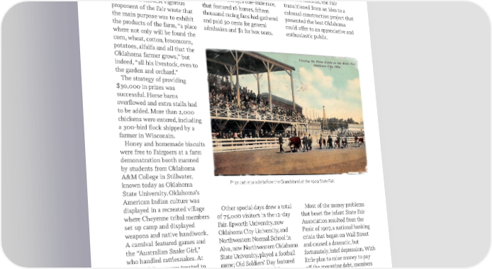 push a button to signal the start But there was no doubt the Even though revenues were of the first State Fair of Oklahoma. most popular attraction of the short to pay expenses, the Charles Haskell, recently elected first State Fair was horse racing, State Fair was declared a huge as the new state’s first Governor, long a fancy of early Oklahomans. success by its founders. In addressed the crowd. After several days of racing the just nine months, the Fair The exposition was largely an Oklahoma Derby, a one-mile race, transitioned from an idea to a agricultural show. A vigorous that featured 16 horses, fifteen colossal construction project that proponent of the Fair wrote that thousand racing fans had gathered presented the best Oklahoma the main purpose was to exhibit and paid 50 cents for general could offer to an appreciative and the products of the farm, “a place admission and $1 for box seats. enthusiastic public. where not only will be found the corn, wheat, cotton, broomcorn, potatoes, alfalfa and all that the Oklahoma farmer grows,” but indeed, “all his livestock, even to the garden and orchard.” The strategy of providing $30,000 in prizes was successful. Horse barns overflowed and extra stalls had to be added. More than 2,000 chickens were entered, including a 300-bird flock shipped by a farmer in Wisconsin. Honey and homemade biscuits were free to Fairgoers at a farm demonstration booth manned by students from Oklahoma A&M College in Stillwater, known today as Oklahoma Prize cattle parade before the Grandstand at the 1909 State Fair. State University. Oklahoma’s American Indian culture was displayed in a recreated village Other special days drew a total Most of the money problems where Cheyenne tribal members of 75,000 visitors in the 12-day that beset the infant State Fair set up camp and displayed Fair. Epworth University, now Association resulted from the weapons and native handiwork. Oklahoma City University, and Panic of 1907, a national banking A carnival featured games and Northwestern Normal School in crisis that began on Wall Street the “Australian Snake Girl,” Alva, now Northwestern Oklahoma and caused a dramatic, but who handled rattlesnakes. At State University, played a football fortunately, brief depression. With night, visitors were treated to game; Old Soldiers’ Day featured little plan to raise money to pay an elaborate set on which was a parade for veterans of the off the mounting debt, members performed “Carnival of Naples,” Spanish American War and the of the Fair Board turned to Henry with high wire acts, musicians, Rough Riders Association; and Overholser, a son of German and costumed actors. A fireworks Kentucky Day, was a reunion of immigrants, who had both the display crowned the evening’s former Kentuckians now living in resources and leadership ability to entertainment. Oklahoma. save the State Fair of Oklahoma. 16