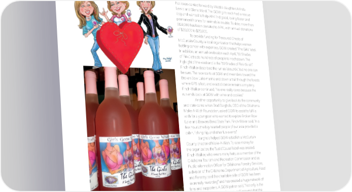 The “Just b’Cause” label was created to help the Make-A-Wish Foundation. It can be used for any worthy cause in the future. has been carried forward by Webb’s daughters Minda Lewis and Glena Ward. The GGW girls each had a rescue dog and wanted to help ARK find good, loving foster and permanent homes for animals in trouble. To date, more than $128,000 has been donated to ARK, with annual donations of $20,000 to $25,000. To provide funding for Treasured Chests of McCurtain County, a local organization that helps women battling cancer with expenses, GGW created “The Girls” label. In addition, an annual celebration each April, “50 Shades of Pink,” attracts hundreds of people to Hochatown. The highlight of the weekend is the “50 Shades of Pink 6k-ish”. Finch-Walker described the run as “about 6k,” but no one can be sure. The race starts at GGW and meanders toward the Broken Bow Lake marina and down a trail through the forests where GPS is lost, and exact distance remains a mystery. Finch-Walker continued, “No one really cares because the run ends back at GGW with wine and cookies.” Another opportunity to give back to the community and state came when Brad Barghols, CEO of the Oklahoma Make-A-Wish Foundation, asked GGW to assist to fulfil a wish for a youngster who wanted to explore Broken Bow Lake and Beavers Bend State Park. Finch-Waker said, “In a few hours, the big-hearted people of our area provided a cabin, fishing trip, and other fun events.” Barghols helped GGW establish a McCurtain County chapter of Make-A-Wish. To raise money for the organization, the “Just b’Cause” label was created. Finch-Walker, who wears many hats, as a member of the Oklahoma Tourism and Recreation Commission and as Public Information Officer for Oklahoma Forestry Services, a division of the Oklahoma Department of Agriculture, Food and Forestry, said the charitable side of GGW has been “extremely rewarding” and has created a huge network of fans and supporters. A GGW patron said, “Not only is the wine superb, I feel better about myself knowing that the purchase of certain labels is helping worthy organizations Girls Gone Wine created “The Girls” label for a wine that raises money for that make Oklahoma a better place to live.” Treasured Chests of McCurtain County, an organization helping women battling cancer. All photos courtesy Girls Gone Wine. 26