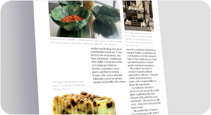 Sage & Elm Apothecary products are carried statewide, including Scissortail Gifts at the Gaylord-Pickens Museum, Implementing fresh ingredients and those aged and cured, at any one time there are more home of the Oklahoma Hall of Fame, in than 150 jars at various stages of fermentation in the Sage & Elm Apothecary plant. Oklahoma City. comfort and healing. Her great- agencies, combined with losing a grandmother would say “Come younger brother to addiction, in listen to the mushrooms, they 2018 Robinson-Hershey founded have a heartbeat,” reinforcing Sage & Elm Apothecary to create their ability to heal and soothe. specialized products to heal, At a young age Robinson- soothe, and treat consumers. Hershey remembers using The product inventory is plants and flowers to help centered around a holistic friends with various ailments. approach to self-care. Using the Following a career in mental earth’s natural resources Each Sage & Elm Apothecary soap is and physical health with various comes with a responsibility to unique in ingredients and appearance. honor the ingredients. Courtesy Scott VO. It is Robinson-Hershey’s practice to always use the whole plant, explaining that each element of the plant has a use and benefit. The process is full circle—from seed to harvest and back to seed. The product line of Sage & Elm Apothecary is the perfect mix of science and art, each item created to “nourish [the 30