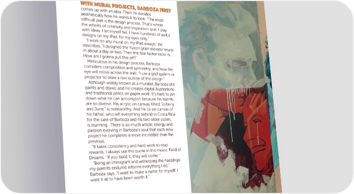 With mural projects, Barboza first comes up with an idea. Then he decides aesthetically how he wants it to look. “The most difficult part is the design process. That’s where the wheels of creativity and inspiration spin. I play with ideas. I let myself fail. I have hundreds of awful designs on my iPad, for my eyes only.” “I work on any mural on my iPad always,” he describes. “I designed the Yukon grain elevator mural in about a day or two. Then the fear factor kicks in. How am I gonna pull this off?” Meticulous in his design process, Barboza considers composition and symmetry, and how the eye will move across the wall. “I use a grid system or projector to draw a raw outline of the design.” Although widely known as a muralist, Barboza still paints and draws, and he creates digital illustrations and traditional pencil on paper work. It’s hard to pin down what he can accomplish because his talents are so diverse. His acrylic on canvas, titled “Johnny and June,” is noteworthy. And his oil on canvas of his father, who left everything behind in Costa Rica for the sake of Barboza and his two older sisters, is stunning. There is so much artistic energy and passion evolving in Barboza’s soul that each new project he completes is more incredible than the previous. “It takes consistency and hard work to reap rewards. I always use the quote in the movie ‘Field of Dreams.’ ‘If you build it, they will come.’” “Being an immigrant and witnessing the hardships my parents endured informs everything I do,” Barboza says. “I want to make a name for myself. I want it all to have been worth it.” “Johnny and June.” Acrylic on canvas. (Courtesy Carlos Barboza) 8