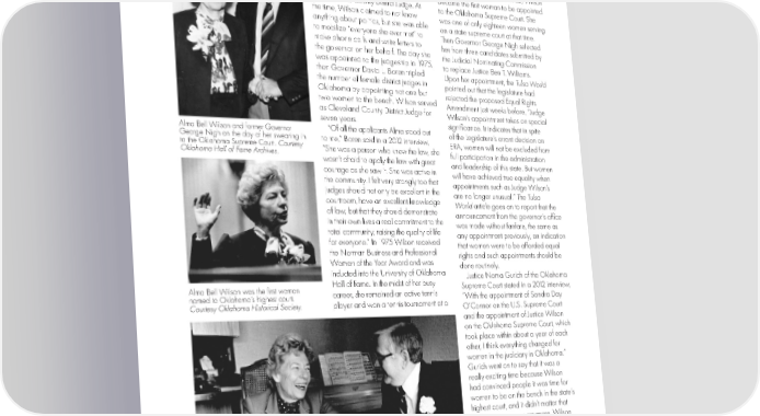 Representatives who wrote an article for 1981 summer judicial conference. the Oklahoma Gazette upon Wilson’s In the 1980s, 5.4% of all federal judges passing in 1999, recalled Wilson’s and less than 5% of state court judges tenacity and drive to seek a judicial were women. Almost half of the states had appointment in Cleveland County. She no women in any courts. In 1982, Wilson helped organize Wilson’s campaign became the first woman to be appointed for Cleveland County District Judge. At to the Oklahoma Supreme Court. She the time, Wilson claimed to not know was one of only eighteen women serving anything about politics, but she was able on a state supreme court at that time. to mobilize “everyone she ever met” to Then Governor George Nigh selected make phone calls and write letters to her from three candidates submitted by the governor on her behalf. The day she the Judicial Nominating Commission was appointed to the judgeship in 1975, to replace Justice Ben T. Williams. then Governor David L. Boren tripled Upon her appointment, the Tulsa World the number of female district judges in pointed out that the legislature had Oklahoma by appointing not one but rejected the proposed Equal Rights two women to the bench. Wilson served Amendment just weeks before, “Judge as Cleveland County District Judge for Wilson’s appointment takes on special seven years. significance. It indicates that in spite Alma Bell Wilson and former Governor “Of all the applicants Alma stood out of the Legislature’s errant decision on George Nigh on the day of her swearing in to me,” Boren said in a 2012 interview, ERA, women will not be excluded from to the Oklahoma Supreme Court. Courtesy “She was a person who knew the law, she full participation in the administration Oklahoma Hall of Fame Archives. wasn’t afraid to apply the law with great courage as she saw it. She was active in and leadership of this state. But women the community. I felt very strongly too that will have achieved true equality when judges should not only be excellent in the appointments such as Judge Wilson’s courtroom, have an excellent knowledge are no longer unusual.” The Tulsa of law, but that they should demonstrate World article goes on to report that the in their own lives a real commitment to the announcement from the governor’s office total community, raising the quality of life was made without fanfare, the same as for everyone.” In 1975 Wilson received any appointment previously, an indication the Norman Business and Professional that women were to be afforded equal Woman of the Year Award and was rights and such appointments should be inducted into the University of Oklahoma done routinely. Hall of Fame. In the midst of her busy Justice Noma Gurich of the Oklahoma Alma Bell Wilson was the first woman career, she remained an active tennis Supreme Court stated in a 2012 interview, named to Oklahoma’s highest court. player and won a tennis tournament at a “With the appointment of Sandra Day Courtesy Oklahoma Historical Society. O’Connor on the U.S. Supreme Court and the appointment of Justice Wilson on the Oklahoma Supreme Court, which took place within about a year of each other, I think everything changed for women in the judiciary in Oklahoma.” Gurich went on to say that it was a really exciting time because Wilson had convinced people it was time for women to be on the bench in the state’s highest court, and it didn’t matter that you were a woman anymore. Wilson gave a voice to views that were never represented before—that of mother, sister, daughter, and wife. She participated in dozens of interviews in the wake of the historic judicial appointment. In a Alma Bell Wilson and her husband Bill in their Pauls Valley home. Courtesy Oklahoma Historical Society. candid confession, Wilson revealed 36