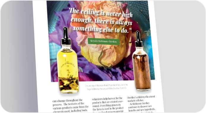 Flowers not only provide color for the various products, but each element of the flower has a unique benefit. Nothing goes to waste. Courtesy Scott VO. The ceiling is never high enough, there is always something else to do.” Krystle Robinson-Hershey Oils are one of the more than 175 products featured in the Sage & Elm Apothecary portfolio. Courtesy Scott VO. can change throughout the volunteers help harvest for the Hershey’s children who attend process. The textures of the products that are created year- markets with her. various products come from the round. Everything grown on As Robinson-Hershey elements used, including buds, the farm is used in the product continues to discover new seeds, and stems for exfoliation. line, and local growers provide benefits and new ingredients, Nothing goes to waste. additional plants, fruits, and the number of products in Robinson-Hershey lives east vegetables. Robinson-Hershey the portfolio of Sage & Elm of the Oklahoma City metro remembers going to markets Apothecary continues to grow. with her family. Her five with her mother, who owned She can be found at markets children earn their allowance an art gallery. Continuing the around the state and her products by working on the farm and tradition, today it is Robinson- are carried by retailers statewide. 3232