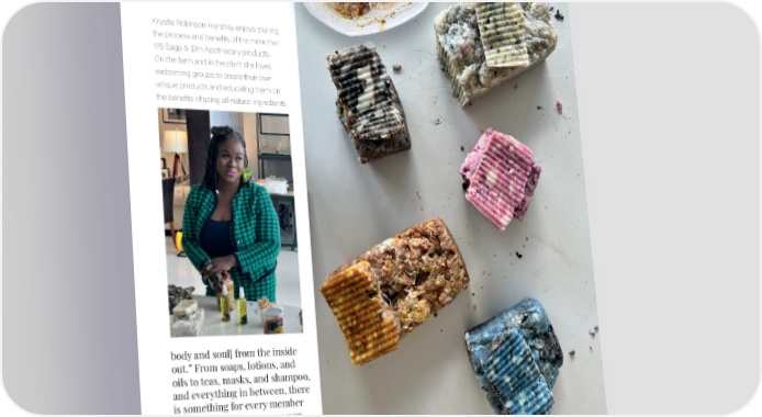 Krystle Robinson-Hershey has perfected the process in ensuring her soaps achieve a high lather. The lengthy process includes 12 hours in the crock pot to reach the precise gelatin consistency. In the plant, multiple crock pots are always “cooking up” the next batch. . Krystle Robinson-Hershey enjoys sharing the process and benefits of the more than 175 Sage & Elm Apothecary products. On the farm and in the plant she loves welcoming groups to create their own unique products and educating them on the benefits of using all-natural ingredients. body and soul] from the inside out.” From soaps, lotions, and oils to teas, masks, and shampoo, and everything in between, there is something for every member of the family. There are no non- natural additives used. The colors in the products are the colors of nature, and the colors After days of preparation and two days to cure, the soap loaf is ready for cutting into bars. Using natural colorants, the colors change through the process with the various ingredients to provide comfort and healing. 31 35