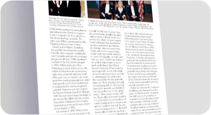Alma Bell Wilson with her presenter, Coach A member of the Oklahoma Hall of Fame Class of 1996, Alma Bell Wilson, seated center, was Barry Switzer, just offstage following her inducted with, from left standing Dr. Charles A. Rockwood, Jr, Keith E. Bailey, and Robert Lorton, and induction to the Oklahoma Hall of Fame. seated Dr. William R. “Bill” Bright and G. W. “Bill” Swisher. Courtesy Oklahoma Hall of Fame Archives. Courtesy Oklahoma Hall of Fame Archives. mostly female audience by stating that her time with the Oklahoma Supreme Court was a citizen of the world and she loved appointment to the Oklahoma Supreme she worked hard to strengthen the state’s Oklahoma football and Barry Switzer.” Court is “a signal to all of us—all of you— judiciary system, and even served on a Wilson indeed had a very special place that almost anything is possible.” This panel to help reform the Texas Supreme in her heart for Coach Switzer. She asked same year, Wilson was inducted into the Court. Colleagues have described her him to be her presenter for her induction Oklahoma Women’s Hall of Fame. as curious, passionate about the law, into the Oklahoma Hall of Fame in 1996. Gurich said of Wilson, “Everything an intellectual who continued to study In her acceptance speech, she thanked was possible. Everything was possible the law with moral courage to apply God for the many opportunities she had in her life. There was never anything that the law as she saw, and an inspiration in life, including the opportunity to be an wasn’t possible and that was a message for others. Her daughter, Lee Anne, said Oklahoman, a distinction which gave her she gave to all of us.” While speaking to that if you were to ask Wilson what was great pride. She said that she had always members of the OU Scholars program her greatest achievement, she would been fascinated with the pioneer spirit of in 1985, Wilson spoke about how say it was the Justice Alma Wilson Oklahomans and was deeply honored to challenging a career in law can be. She Seeworth Academy. Wilson wanted to be recognized as an Oklahoman. Wilson told the scholars how she worked every help people who were unable to help praised her family, friends, and colleagues night, every weekend, and every week themselves, and was a fervent advocate for their role in her success, claiming that of the year. Even on vacation, she would for reforming judicial juvenile justice. she could not have achieved all she had spend time reading transcripts from district She treasured the time she spent at the alone. Of her late husband Bill, she said he and appeals courts. She firmly believed district court level, grappling with tough not only always supported her but he had in working hard to reach your greatest issues involving children. The faces and very high expectations of her. potential. That same year she received stories of children who were held back Wilson was someone who considered the Pioneer Woman Award. In 1986 and from success because of their parents, herself lucky, never having set out with a 1989 she was named Appellate Judge of peers, or their communities stuck with plan to be “the first woman” of anything. the Year by the Oklahoma Trial Lawyers her. The founding of Seeworth Academy She didn’t set out with a roadmap or Association. Oklahoma City University fulfilled her dream to provide children of blueprint for success, she simply worked bestowed upon her an Honorary Doctor troubled backgrounds the resources and hard everyday in a field she was truly of Law degree in 1992. attention needed to succeed. She was passionate about, she was confident in On January 4, 1995, Wilson made known for being very stoic on the bench, herself and what she could accomplish. history again when she was sworn in as showing little emotion and speaking in Justice Wilson was a remarkable woman, Chief Justice of the Oklahoma Supreme an articulate monotone. Contrasting that ahead of her time. The success she found Court, becoming the first woman to hold serious and calm demeanor, she was practicing law opened doors and paved the position. The court selects from its a loud and vibrant cheerleader at OU the way for even more Oklahomans to members a Chief Justice and a Vice Chief football games. believe that anything is possible. On Justice, with a new Chief Justice selected Justice Yvonne Kauger stated in a 2012 the night of her Oklahoma Hall of Fame every two years. The Chief Justice interview, “She had heart, she had grace, induction she told reporters, “Our people presides at all court sessions and chairs she had a zest for life. She played tennis are still our best resource. The best people the state judicial conference. During her with Justice Sandra Day O’Connor. She in the world are from Oklahoma.” 38