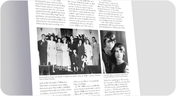 town during the Depression. Her sister class of one hundred students. In the settled in Pauls Valley on the same street and their childhood friends knew she 1940s, only 2.4% of the nation’s lawyers where Wilson grew up. She chose to was destined to fulfill her dream and were women. stay home and raise her daughter until become a career woman. Wilson was a Wilson graduated law school at a she was in high school. Wilson didn’t just straight-A student, described as brilliant, time when the roles of women and men stay at home, it was during this time she industrious, outgoing, and hardworking. began to shift in the United States. The earned a pilot’s license. In addition to her and her sister being country was entering World War I and Georgia Nelson, a writer for The athletes on the school’s tennis team, the increase of labor demands, coupled Oklahoman, penned a 1957 article she played the piano and was often with the departing of soldiers, created titled “Seven Women Judges Win Place selected for the lead role in school plays. opportunities for women in industries in Man’s Profession”. In it she stated, Wilson’s hard work as a young student previously dominated by men. Though the “Oklahoma’s women lawyers could not be was recognized when she was named end of the war would mean employers said to dominate the state judiciary—yet. valedictorian for her graduating class in wanted to give back those positions to But keep an eye on them. Seven have made 1935. At the Pauls Valley High School returning veterans, there was a growing a wedge in what until very recent time graduation, she played the piano as her number of career-oriented women who was considered strictly as a man’s field.” class walked in and as they shuffled out, believed working outside the home, In the 1960s, Wilson returned to delivering her class address in between. combined with being a wife and a practicing law with the goal of earning a Wilson and her sister would go on to mother, fulfilled them. The make-up judicial appointment. She became a Pauls Surrounded by family and friends, Alma Bell married Bill Wilson in 1948. Courtesy Oklahoma Alma Bell Wilson and her twin sister Wilma. Hall of Fame Archives. Courtesy Oklahoma Hall of Fame Archives. study at the University of Oklahoma. of the country’s labor force gradually Valley Municipal Judge in 1967, serving Their father would pass away during began to change. for two years. In 1969 she was appointed their junior year. Their mother, a talented In 1941, Wilson was one of the first Special District Judge for Garvin and seamstress that made most of their clothes women to serve as a federal court law McClain counties, a post she filled for as children, moved to Norman and clerk in Oklahoma. She worked in the six years. In 1974 she received the Guy opened a boarding house to make sure offices of U.S. District Judge Eugene Brown Award for extraordinary service in her daughters finished college. After Rice of Muskogee, thus beginning her recognition of her four years of service as graduation, her sister married, but Wilson dedication to improving the administration a member of the OU Association Board continued on to law school at OU. She of justice. In her early career, Wilson of Directors. Prior to her board term she worked as a secretary on campus during worked at many prominent law firms in served as a member of the Alumnae the school year and spent her summers Oklahoma City and Pauls Valley. This led Council. She was also the recipient of the working at law offices in Oklahoma City. her to meeting Bill Wilson. They married 1974 Outstanding Chi Omega Award. She earned her law degree in 1941 and in 1948 and welcomed their only child, Cleta Deatherage Mitchell, a former was one of six women in the graduating daughter Lee Anne, in 1951. The family member of the Oklahoma House of 35 35