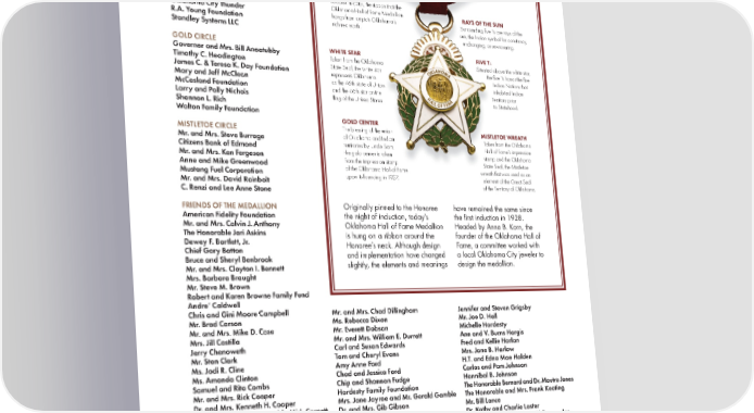 FRIENDS OF THE MEDALLION GIVING SOCIETY Friends of the Medallion have a shared interest in preserving and telling the stories of extraordinary Oklahomans. Their support sustains the 95-year tradition of recognizing accomplished Oklahomans with the state’s highest honor–induction into the Oklahoma Hall of Fame. MISSION PARTNERS Mr. and Mrs. Bob Burke THE MEANING BEHIND THE OKLAHOMA The Chickasaw Nation HALL OF FAME MEDALLION E.L. and Thelma Gaylord Foundation Oklahoma Chiller The Puterbaugh Foundation CONSTANCY CIRCLE RIBBON Peggy Kates Reddish in color, the ribbon that the Oklahoma City Thunder Oklahoma Hall of Fame Medallion RAYS OF THE SUN R.A. Young Foundation hangs from depicts Oklahoma’s Surrounding five Ts are rays of the Standley Systems LLC rich red earth. sun, the Indian symbol for constancy, unchanging, or unwavering. GOLD CIRCLE WHITE STAR FIVE Ts Governor and Mrs. Bill Anoatubby Taken from the Oklahoma Situated above the white star, Timothy C. Headington State Seal, the white star the five Ts honor the five James C. & Teresa K. Day Foundation represents Oklahoma Indian Nations that Mary and Jeff McClean as the 46th state of Union inhabited Indian McCasland Foundation and the 46th star on the Territory prior Larry and Polly Nichols flag of the United States. to Statehood. Shannon L. Rich Walton Family Foundation GOLD CENTER MISTLETOE CIRCLE The blessing of the union MISTLETOE WREATH Mr. and Mrs. Steve Burrage of Oklahoma and Indian Taken from the Oklahoma Citizens Bank of Edmond territories by Uncle Sam, Hall of Fame’s impression Mr. and Mrs. Ken Fergeson the gold center is taken stamp and the Oklahoma Anne and Mike Greenwood from the impression stamp State Seal, the Mistletoe Mustang Fuel Corporation of the Oklahoma Hall of Fame wreath first was used as an Mr. and Mrs. David Rainbolt upon its founding in 1927. element of the Great Seal C. Renzi and Lee Anne Stone of the Territory of Oklahoma. FRIENDS OF THE MEDALLION Originally pinned to the Honoree have remained the same since American Fidelity Foundation the night of induction, today’s the first induction in 1928. Mr. and Mrs. Calvin J. Anthony Oklahoma Hall of Fame Medallion Headed by Anna B. Korn, the The Honorable Jari Askins is hung on a ribbon around the founder of the Oklahoma Hall of Dewey F. Bartlett, Jr. Honoree’s neck. Although design Fame, a committee worked with Chief Gary Batton and implementation have changed a local Oklahoma City jeweler to Bruce and Sheryl Benbrook slightly, the elements and meanings design the medallion. Mr. and Mrs. Clayton I. Bennett Mrs. Barbara Braught Mr. Steve M. Brown Robert and Karen Browne Family Fund Andre’ Caldwell Chris and Gini Moore Campbell Mr. and Mrs. Chad Dillingham Jennifer and Steven Grigsby Mr. Brad Carson Ms. Rebecca Dixon Mr. Joe D. Hall Mr. and Mrs. Mike D. Case Mr. Everett Dobson Michelle Hardesty Mrs. Jill Castilla Mr. and Mrs. William E. Durrett Ann and V. Burns Hargis Jerry Chenoweth Carl and Susan Edwards Fred and Kellie Harlan Mr. Stan Clark Tom and Cheryl Evans Mrs. Jane B. Harlow Ms. Jodi R. Cline Amy Anne Ford H.T. and Edna Mae Holden Ms. Amanda Clinton Chad and Jessica Ford Carlos and Pam Johnson Samuel and Rita Combs Chip and Shannon Fudge Hannibal B. Johnson Mr. and Mrs. Rick Cooper Hardesty Family Foundation The Honorable Bernard and Dr. Mautra Jones Dr. and Mrs. Kenneth H. Cooper Mrs. Jane Jayroe and Mr. Gerald Gamble The Honorable and Mrs. Frank Keating Mrs. Terri and The Honorable Mick Cornett Dr. and Mrs. Gib Gibson Mr. Bill Lance Sandy and Art Cotton Earnie and Marilyn Gilder Dr. Kathy and Charlie Laster Bill and Carol Crawford Senator A.J. and Kenneth Griffin Larry and Marilyn Lee, RAM Energy, Inc. Page Davidson Mr. David Griffin Roxana and Robert Lorton THANK YOU TO ALL DONORS OF A portion of every donation, regardless of the amount, goes toward funding Oklahoma: Magazine of the THE OKLAHOMA HALL OF FAME Oklahoma Hall of Fame and its distribution to every senior high school library statewide. 46